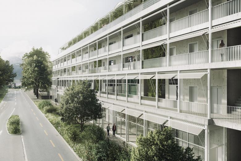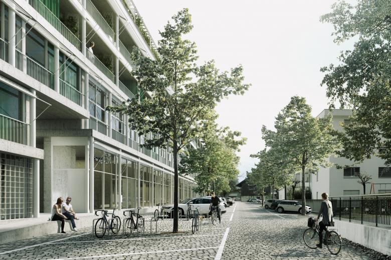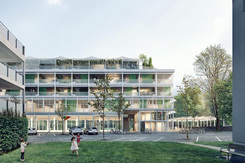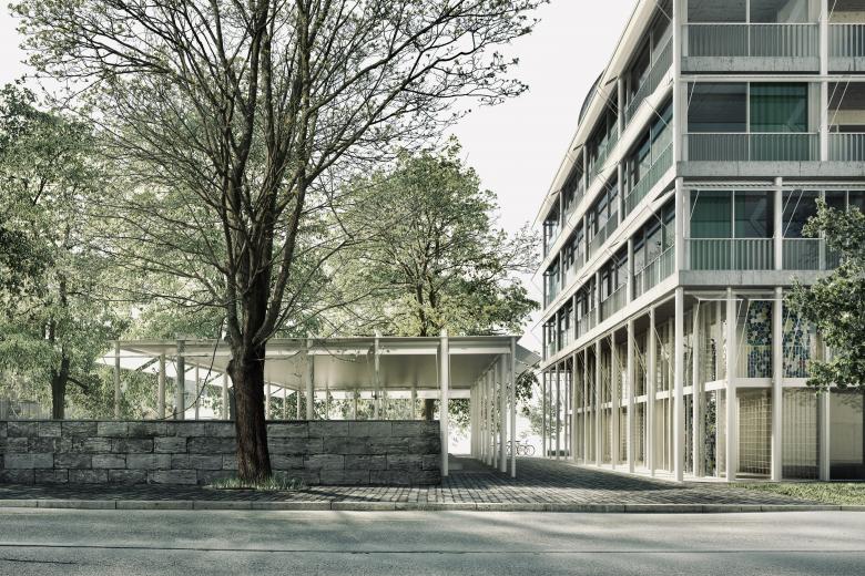 In der angrenzenden Baulücke entsteht ein urban geprägter Solitärbau in Form eines städtischen Blocks, der die maximal zulässige Ausnutzung erreicht. Das Gebäude nimmt Bezug auf funktionale Rasterarchitekturen der 1960er-Jahre und setzt sich bewusst vom heterogenen Umfeld ab. Erschlossen wird es über offene Durchgänge, Laubengänge und Treppenanlagen im Aussenklima, die Begegnungen fördern, ohne sie zu erzwingen.