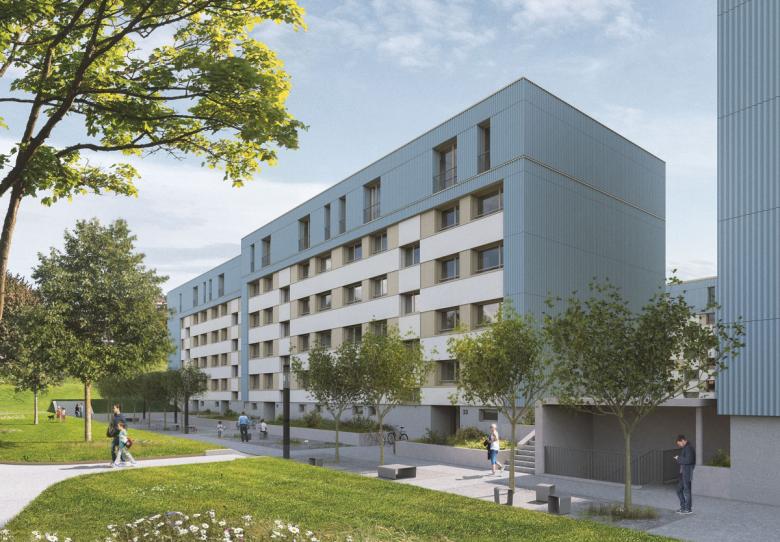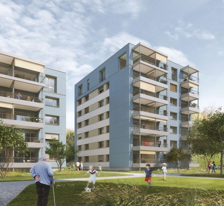 Die Aufstockung in Holzrahmenbau ermöglicht es, die bestehenden 200 Wohnungen mit weiteren 36 Wohnungen und einem diverseren Angebot zu ergänzen. Der heutige Zustand der Gebäude bedingt eine Totalsanierung der Wohnungen, Haustechnik und der ganzen Gebäudehülle. Alt und Neu werden so zu einem gemeinsamen Ganzen. Die bestehenden Balkone werden rückgebaut und mit einem modularen System ersetzt und vergrössert.