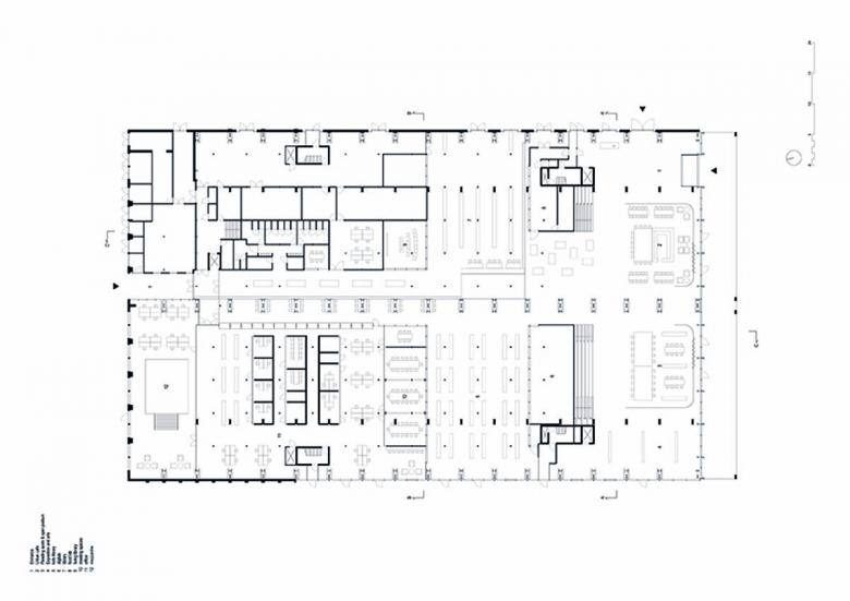 The LocHal is the new public library of the City of Tilburg. A former locomotive hangar has been transformed into a public meeting place. It revives a former industrial area on ‘the wrong side of the tracks’ into a vibrant mixed-use district. The LocHal exemplifies how a city’s industrial history, can form the roots for a new symbol of public life. The LocHal redefines the library typology. While preserving ‘book consumer’ facilities, it also stimulates interaction and the creation of new knowledge. The building forms a covered public space, housing amenities shared by the library, arts organizations, and co-working facilities. In addition to areas for public events, the building has a number of ‘labs’ where visitors can learn new skills. Large open spaces match the monumental value of the hall and the idea of an 'open' library. From the entrance hall, the landscape of stairs leads visitors up to the peripheral galleries where you can retreat into one of the quieter reading areas. Higher up, the filtered light and the refined details of the structure create a more ephemeral atmosphere. A large public balcony offers panoramic views over the city. The LocHal catalyzes the redevelopment of the Railway Area. It transforms a ‘forbidden city’ that for decades divided the city in two, into an attractive destination that connects the historic center, with the North of Tilburg. The architecture is a reinterpretation of the original building (1932). The main structure determines the rhythm and language of the new architecture. Perhaps the most conspicuous feature of the building is its sheer size. With a height of fifteen meters, it is both imposing and inviting. The entrance hall forms a covered square with large reading tables (doubling as podia), an exhibition area and a coffee kiosk. The space folds up into a landscape of stairs that can be used as event space for over a thousand spectators. The spaciousness is strengthened by diagonal views across the interior, enabled by smart engineering. Climate zones preserves the openness of the building; heating visitors in key contact zones instead of entire spaces. Six grand, movable textile screens enable flexible separation of areas. This made it possible to preserve the LocHal as one large space, rather than inserting closed volumes or replacing it altogether. The library capitalizes the carefully preserved existing structure, minimizing new structural elements. Columns, floors, parapets and the textile screens form the ‘grand gestures’ that emphasize the perpendicular axes of the historical industrial processes in the building. The imperfections of the existing materials contribute to the productive and public atmosphere. New additions are constructed in pure materials such as black steel, concrete, glass, and wood, applied over large surfaces. Six textile screens that extend to ceiling height accentuate the scale of the space while improving the acoustics. The screens, with a surface area of 4.125 m2, can be repositioned in numerous configurations. To separate the co-working area from the higher library floors, or to create a small auditorium for instance. The materials reveal their characteristic textures when viewed at close hand. The intricate window frames and translucent textile screens play with the daylight, creating refined shadow patterns. After dark, the building is turned ‘inside out’, with the interior becoming the main source of light: an inviting beacon in the city center.