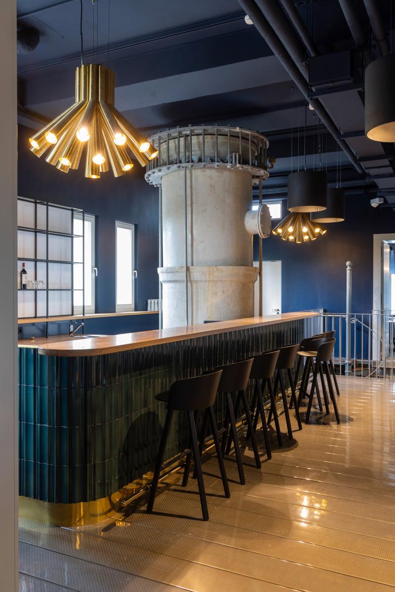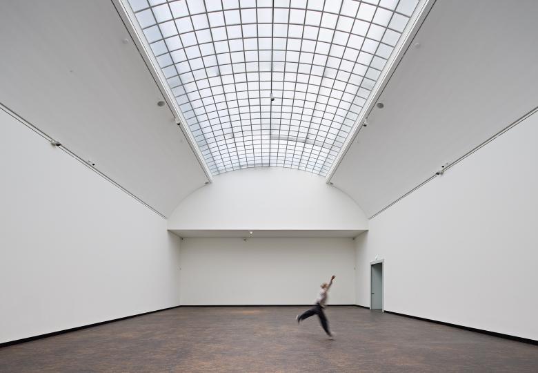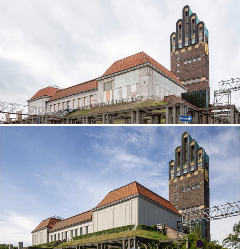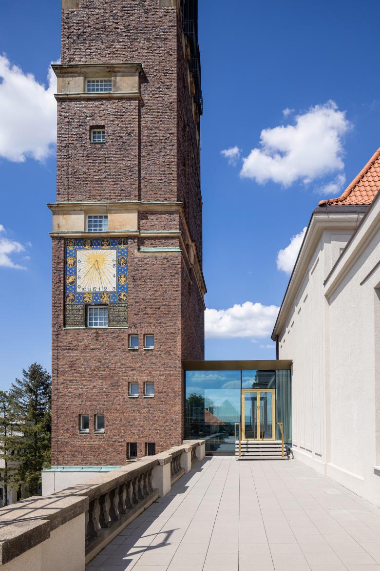 Durch eine intelligente Umverteilung des Raumprogramms entsteht auf der Westseite zum Platanenhain Platz für ein neues Café, das nun auch barrierefrei erschlossen ist. Zwischen Ausstellungsgebäude und Hochzeitsturm wird durch sensiblen Rückbau vorausgegangener Umbauten ein neuer repräsentativer Raum möglich, der sich in seiner architektonischen Ausformulierung eindeutig als Bauteil der 2020er Jahre zu erkennen gibt und so zusammen mit vielen weiteren sorgsam entwickelten Details dem ikonischen Bauwerk eine weitere, heutige Zeitschicht hinzufügt.