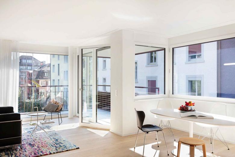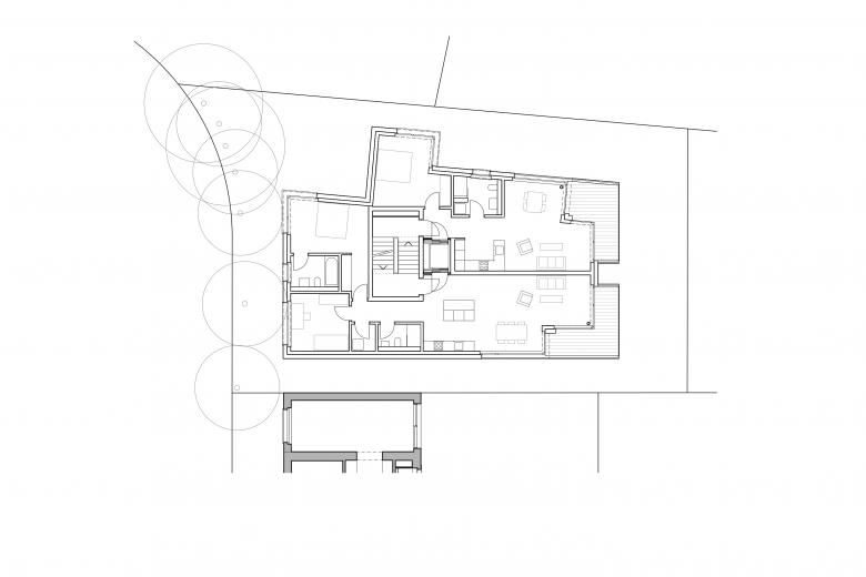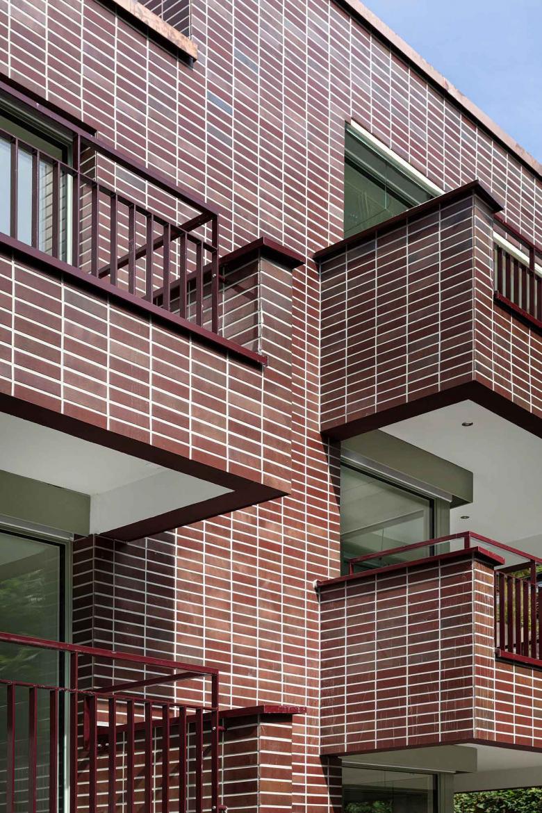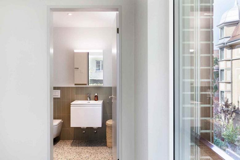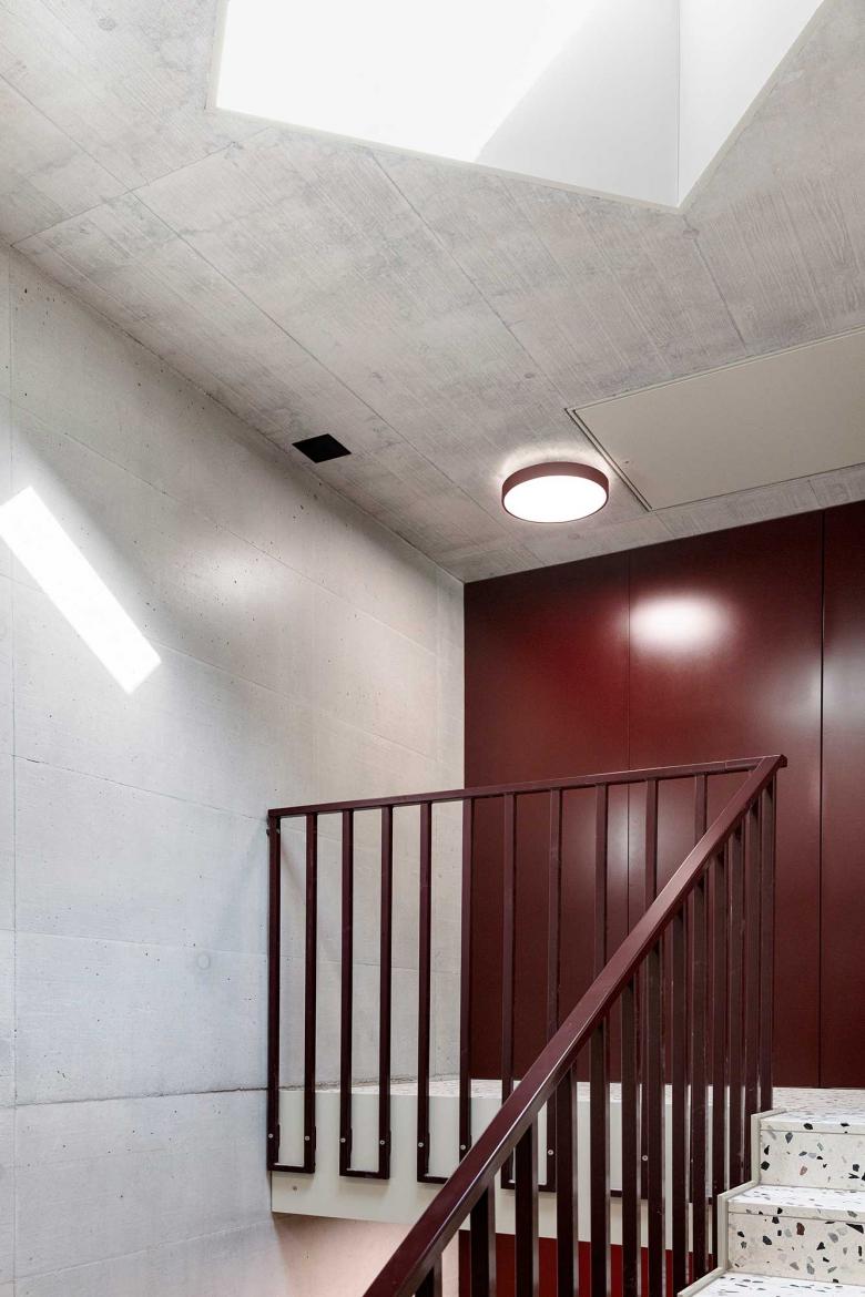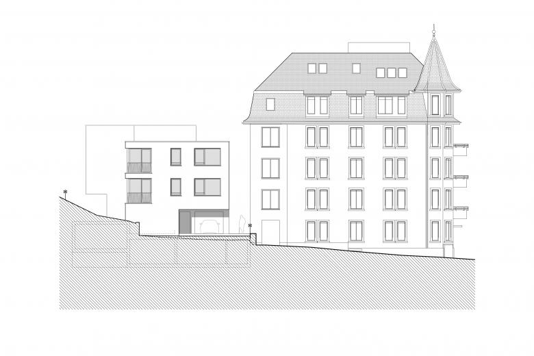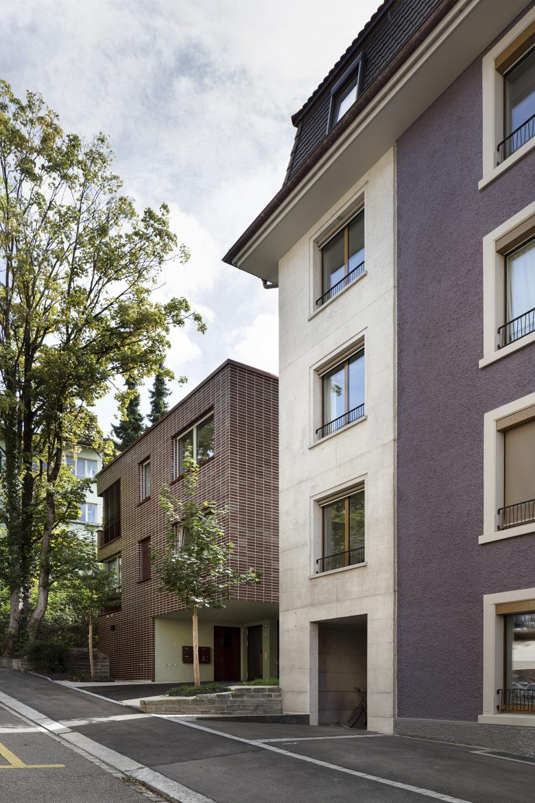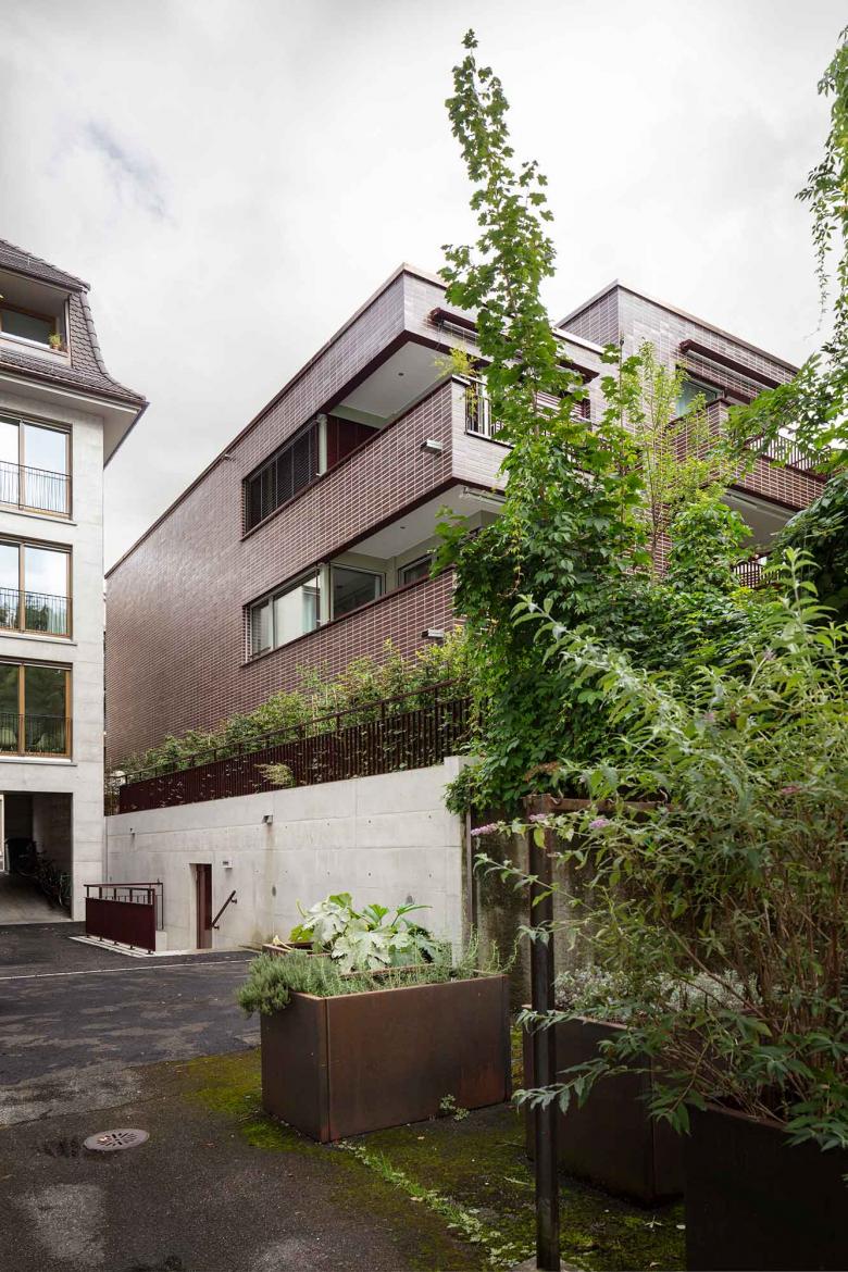 Von Anfang an war klar, dass auf dieser Parzelle nur ein aussergewöhnliches Haus stehen kann. Zwischen steil ansteigendem Gelände und den Gründerzeithäuser entlang der Mutschellenstrasse formt neben dem Baurecht die Topografie, die Vegetation der Baumschutzzone und der auf die Grenze gesetzte Sichtbetonanbau des Nachbargebäudes ein skulpturales Volumen. Der Höhenversatz in der Längsachse verlangt nach der Split-Level-Konzeption, welche es erlaubt, sämtliche 5 Wohnungen direkt aus dem Lift zu erschliessen. Die grossen Fenster zum Hof schaffen einen fliessenden Übergang zwischen Innen und Aussen. Von der Rossbergstrasse her schützen bestehende, hohe Bäume vor direkten Einblicken. Die Idee der «Schmuckdose im Garten» wird mit einer hochwertigen Gebäudehülle aus einer rötlich-braunen Klinkerfassade in Kombination mit grünen Fenstern sowie kupfernen Spenglerarbeiten umgesetzt. Das Farb- und Materialkonzept nimmt Bezug auf die vorhandene, erdig-grüne Farbenvielfalt der Umgebung.