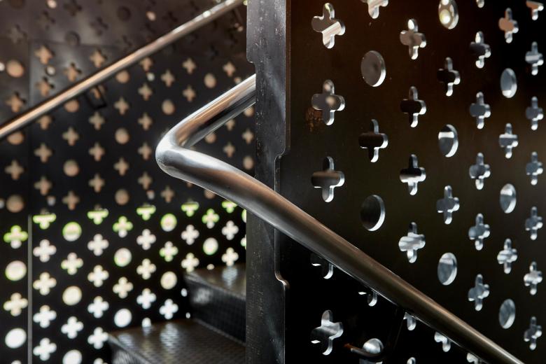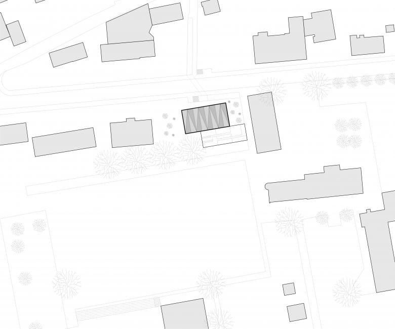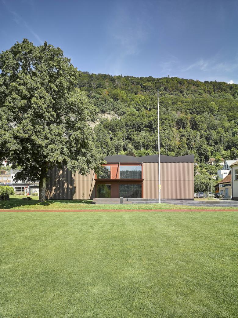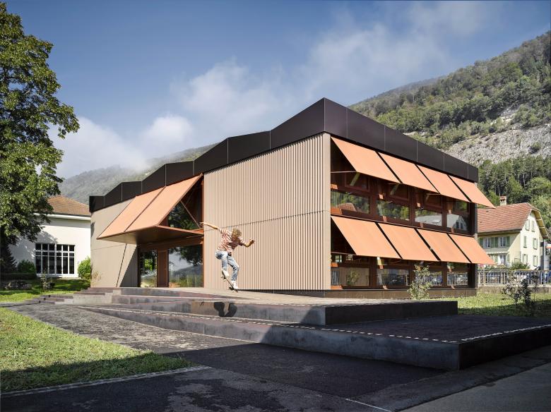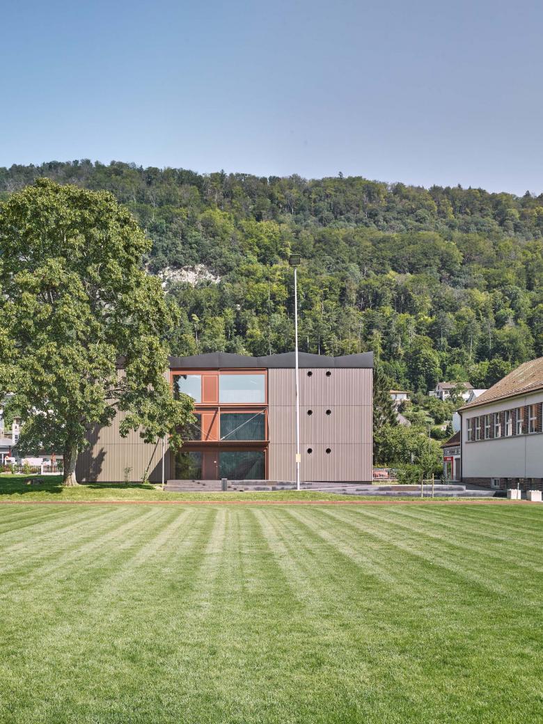 Die Situation des Neubaus ist einerseits durch die starke Präsenz des Juramassivs, sowie andererseits durch die umgebenden Schulbauten geprägt. Beide Aspekte finden ihre Repräsentation in der Fassadengestaltung des Neubaus. Das mineralische Eternit der Nord- und Südfassade korreliert mit den Farben des Gebirges und des Waldes. Die farblich differenziert ausgestalteten Fensterfronten der Ost- und Westfassade stehen im Dialog mit den kunstvollen und farblich facettenreichen Klinkerelementen der bestehenden Schulbauten und der umgebenden Dachlandschaft. Die, aufgrund von Sicherheitsvorschriften, obligatorischen visuell-taktilen Markierungen auf den Stufen der Zugangsrampe wurden auf spielerische Weise umgesetzt. Medizinische Fachausdrücke auf Latein diverser Knochenbrüche und anderer Verrenkungen, markieren jeweils die Kanten.