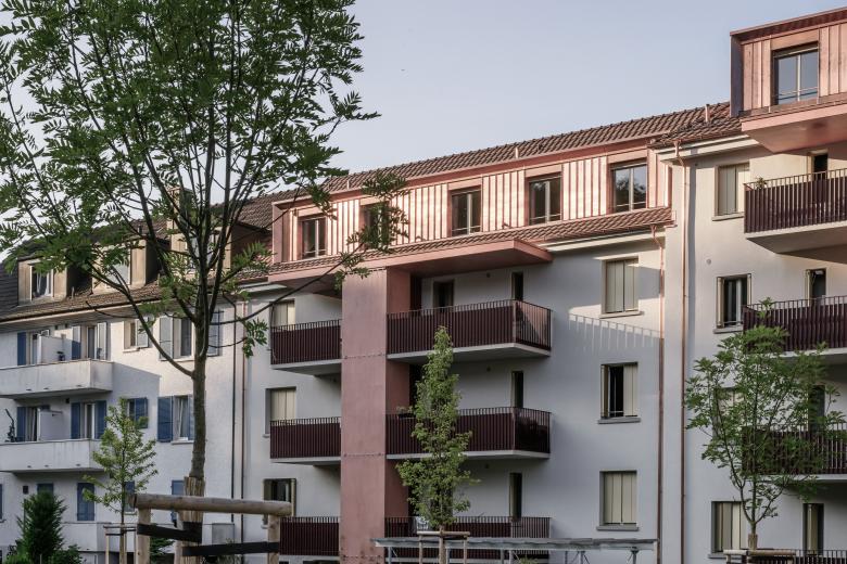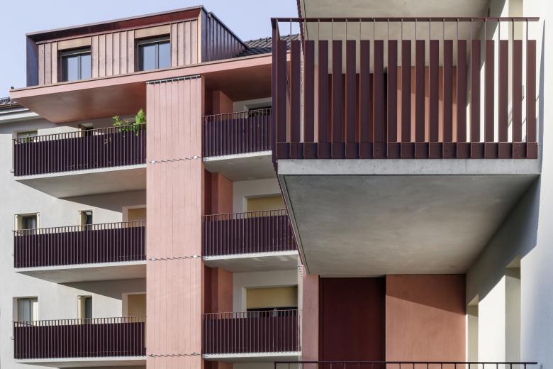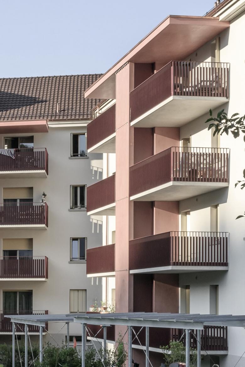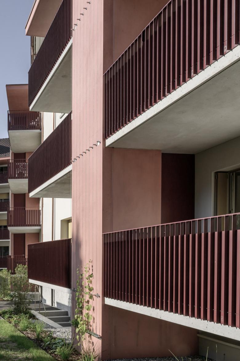 Die Statik der Balkone übernehmen raumhohe Z-Elemente, welche die horizontalen, auf beiden Seiten weit auskragenden Betonplatten tragen. Durch die abgewinkelte Geometrie dieser Elemente entstehen kleine Aussenräume, welche als Aussenreduits, die in ihrer Fläche um gut das Doppelte vergrösserten Balkone zusätzlich aufwerten. Gleichzeitig schaffen die Z-Elemente räumliche Distanz zwischen den Nutzern und garantieren die geschätzte Privatsphäre.