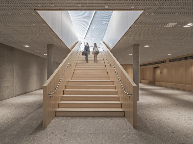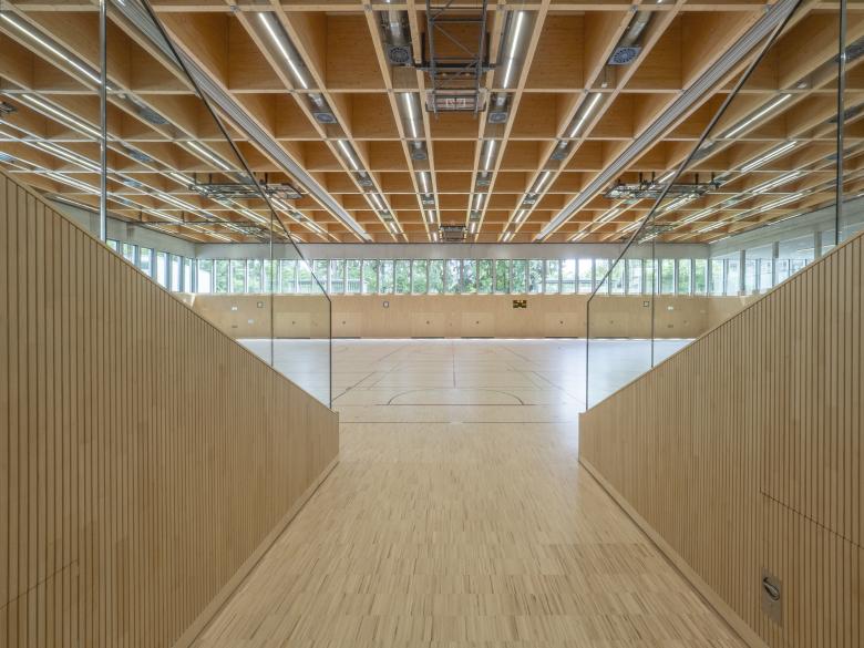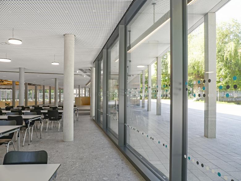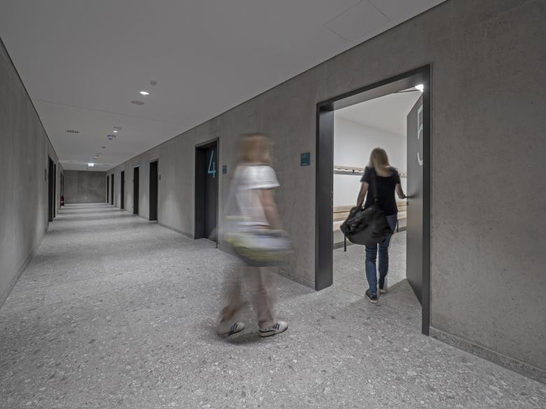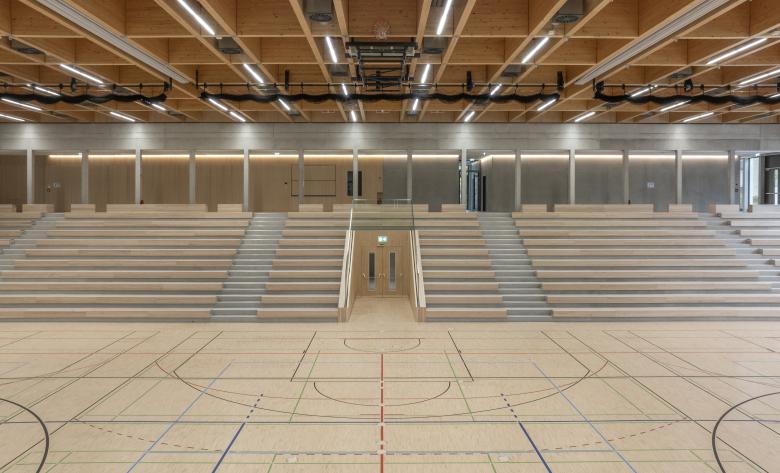 Vom Foyer aus verteilen sich die Besucher in die bestuhlte untere Hallenebene oder auf den Tribünenbereich. Der Hallenraum ist zum Foyer offen und erlebbar. Ein transparentes Raumgefüge bietet Orientierung und bringt viel Tageslicht ins Gebäude. Schiebeelemente ermöglichen die Trennung und Verbindung des Hallenbereiches vom/ zum Foyer für Veranstaltungen die hohe Anforderungen an Verdunkelung und akustischer Abgrenzung zum Foyer haben. Eine große Freitreppe bringt Tageslicht auch in die untere Ebene des Foyers. Die Schüler erreichen das Gebäude über einen Eingang, der direkt an das Schulareal angrenzt, und gelangen so zur Mensa. Zum Sportunterricht gelangen die Schüler über die unterirdische Verbindung von der Schule zu den Umkleiden. Die Anlieferzone für die Küche und den Hallenbereich befindet sich auf der Nordseite des Gebäudes und funktioniert unabhängig. Über einen Lastenaufzug kann der Hallenbereich direkt beliefert werden, ohne dass der Weg der Schüler zur Mensa dadurch beeinträchtigt wird.