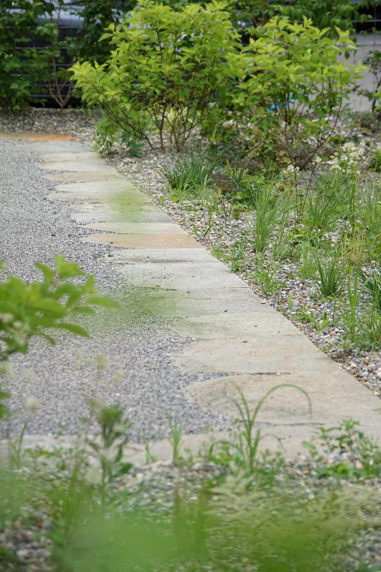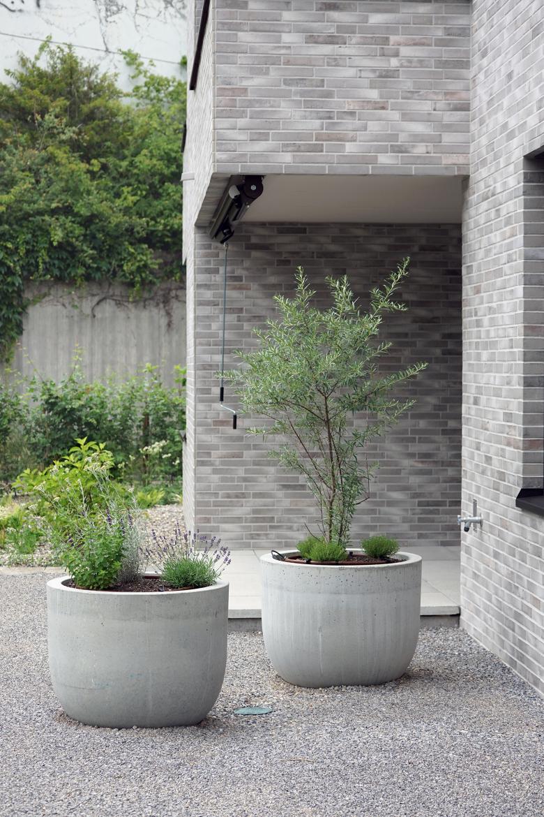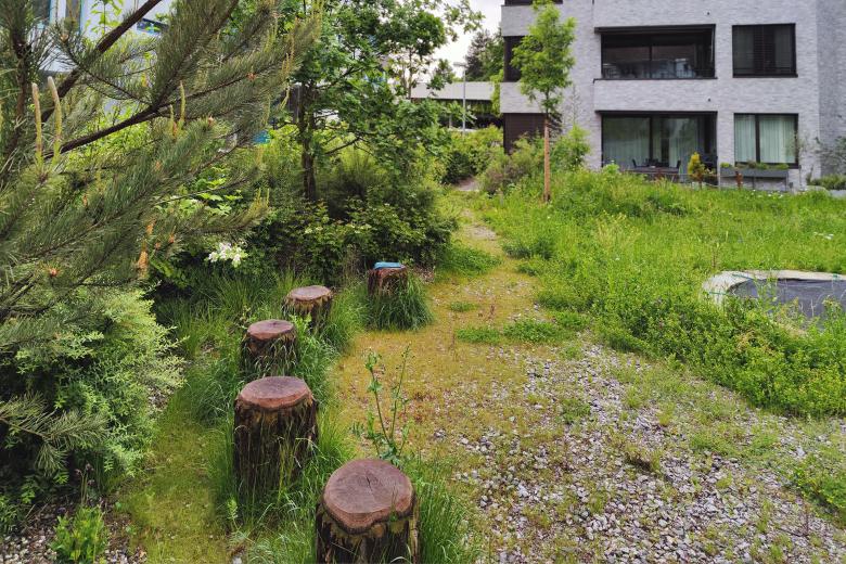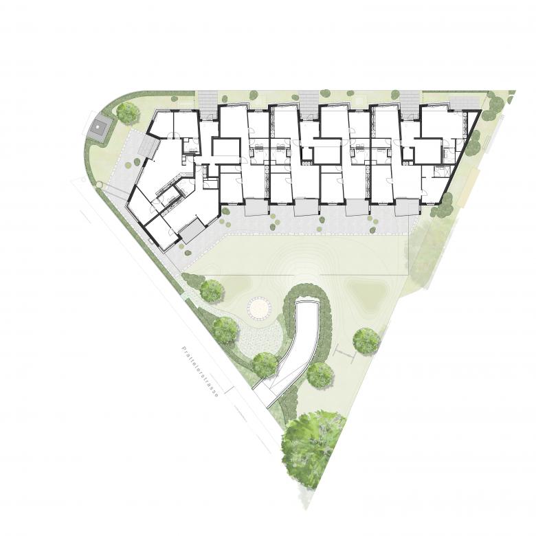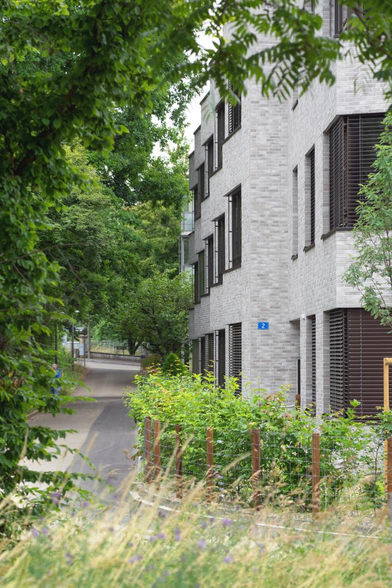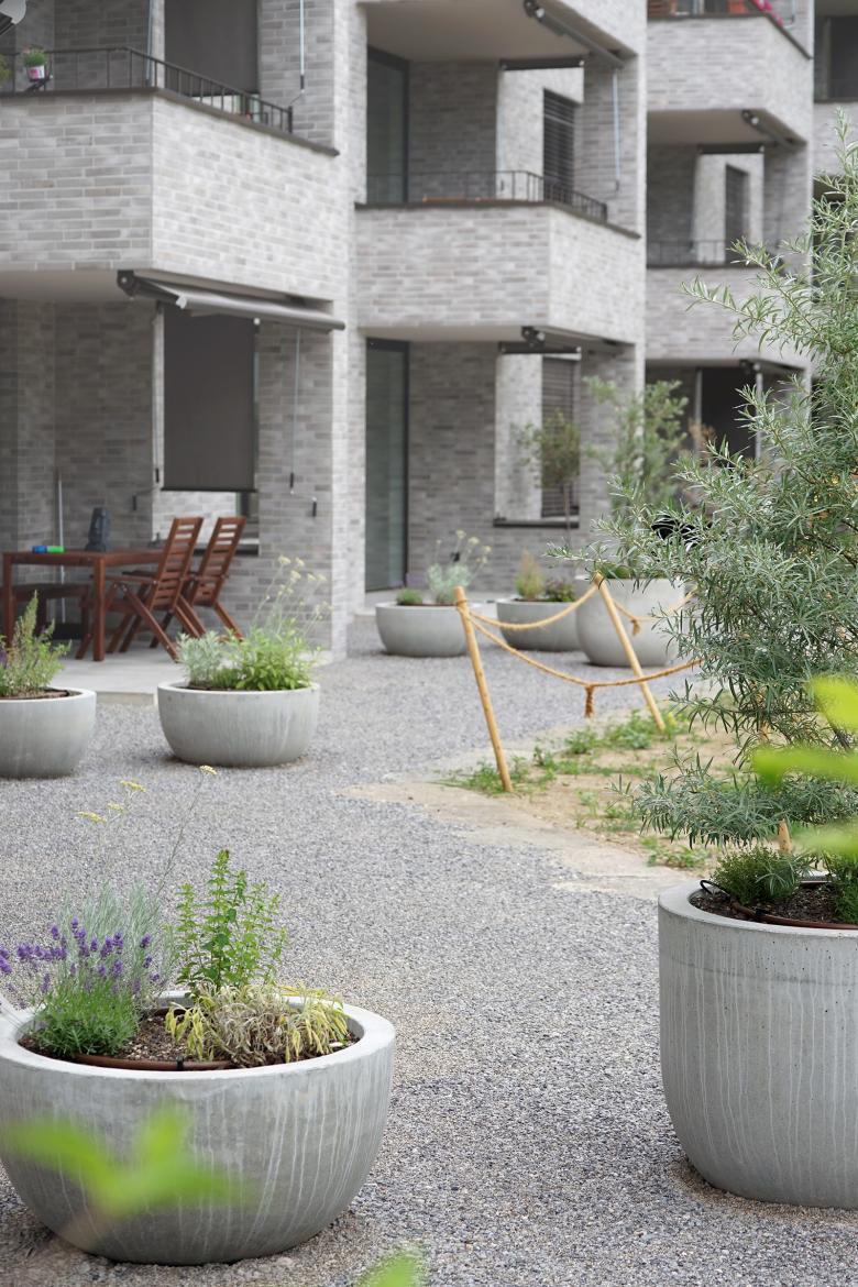 Das Grundstück liegt in einem Gebiet welches dreiseitig von der Stadtautobahn umschlossen ist. Der Neubau mit 30 Wohnungen spannt sich zwischen dem 4-geschossigen Genossenschaftsbau im Osten und dem 4-geschossigen Gewerbebau im Süden und definiert so einen grossflächigen Gartenraum, der sowohl für die Wohnungen im Neubau, wie diejenigen der Genossenschaft einen Mehrwert und Weitblick schaffen. Die Erdgeschosswohnungen verfügen gartenseitig über private Sitzplätze welche sich auf leicht erhöhten Ortbetonplatten vom gemeinschaftlich genutzten Kiesbelag abheben. Dieser findet zu den Grünflächen hin einen klaren Abschluss durch sorgfältig behauene und verlegte Granitplatten welche als ReUse Objekte aus der rückgebauten Gartenanlage wiederverwendet wurden. Grossvolumige Pflanztöpfe mit Nutzpflanzen dienen als Filter zwischen den benachbarten Sitzplätzen.
