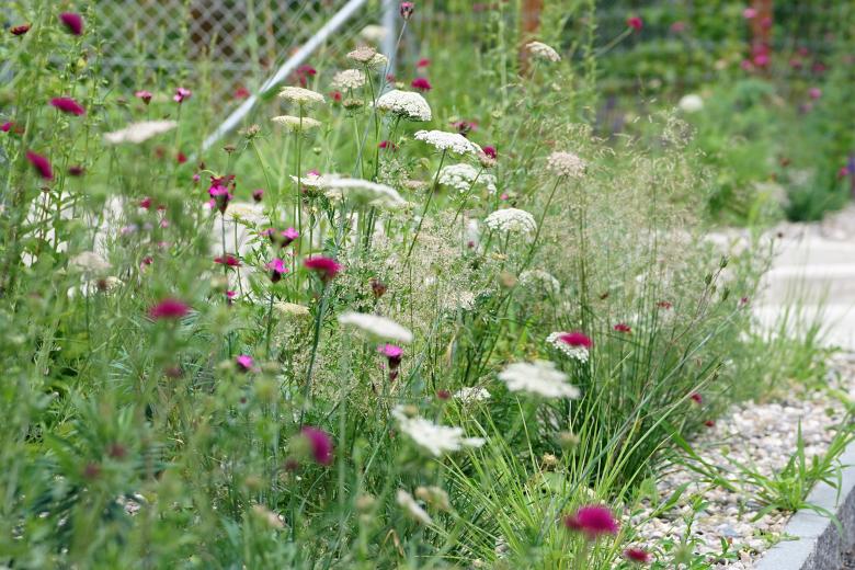 Eine robuste Mischstaudenpflanzung mit Hortensien sorgt entlang dem Singerweg für die notwendige Distanz zwischen dem engen Strassenraum und der Fassade.