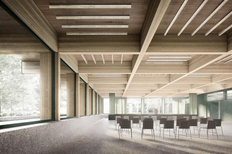 Die Gebäudestrukturen orientieren sich zur Mitte, bebaut mit dem zentralen Pavillon als Ort der Orientierung sowie Begegnung. Die Anlage ist als gerichtete Holzstruktur konzipiert. Die Träger bilden ein Gestell, das mittels nichttragender Wände flexibel genutzt werden kann. Die Kassettendecke des Forums nimmt beide strukturellen Ausrichtungen der umliegenden Gebäude auf und wird mit dieser allseitigen Orientierung zum zentralen Bezugsort. Die orthogonale und zur Umgebung hin offene Setzung verbindet räumlich die Anlage mit dem Naturraum der Lorze, schafft einen offenen Übergang zur umliegenden Stadt und bildet ein campusartiges, primarschulgerechtes Raumgefüge.