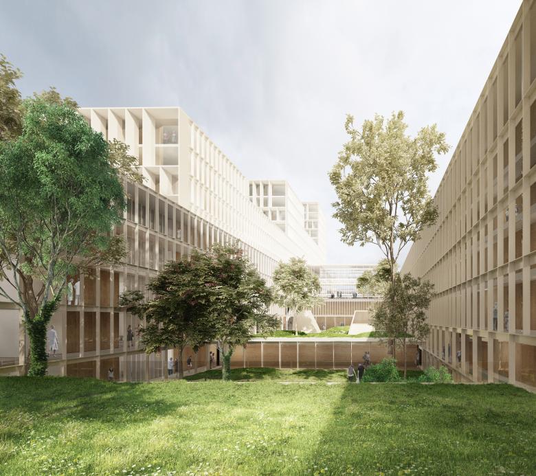The centre is extended to the south and west with a new teaching and research building. The key point of this intervention is the creation of a large access plaza that connects the different hospital functions and that will become a climate and health garden. The project is organized in blocks, parallel to the slope, changing in height, thus fragmenting the total volumetric configuration of the building, so that it adapts and responds to the environment.