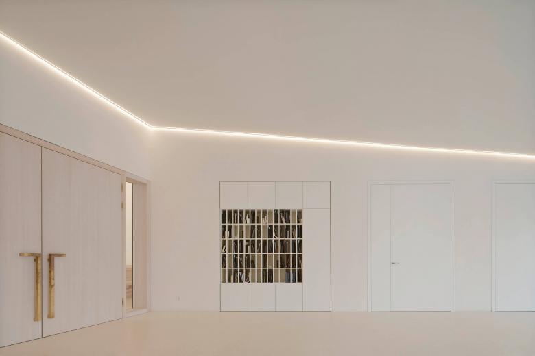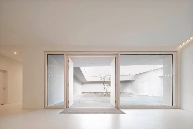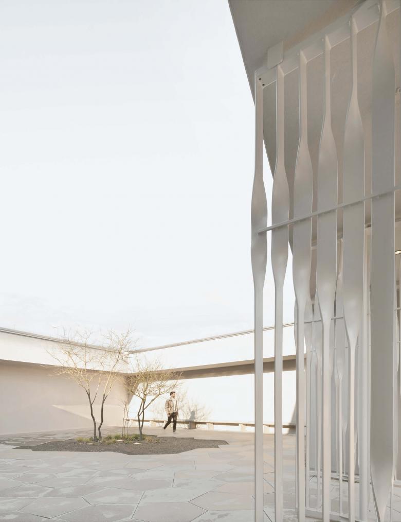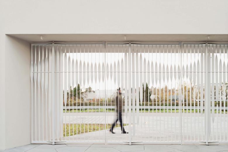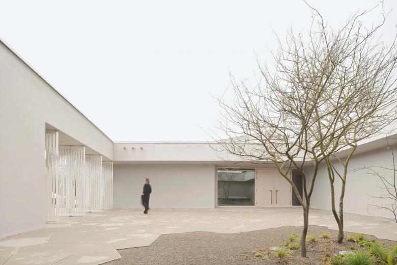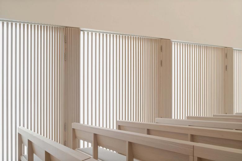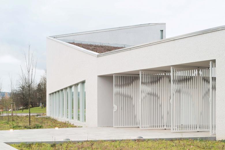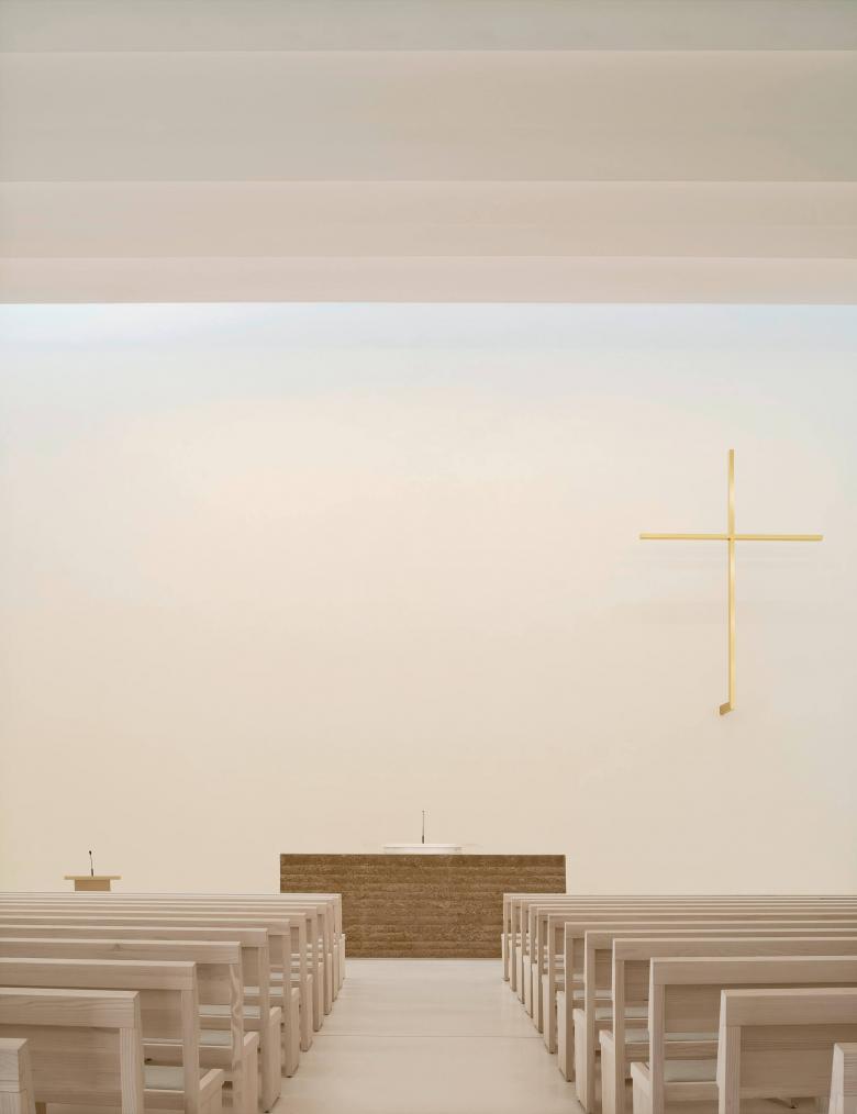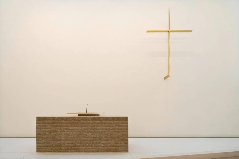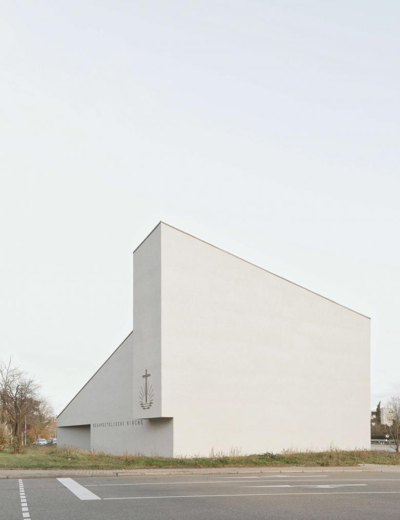 Aus einer baumbestandenen Wiese, die von der mehrspurigen Bundesstraße 294, einem Parkplatz und der benachbarten Bahntrasse flankiert wird, erhebt sich der hell schimmernde, 15 m hohe Neubau der Neuapostolischen Kirche. Der skulptural geformte, polygonale Baukörper markiert den westlichen Stadteingang Pforzheims und ist sofort als Sakralbau erkennbar. Sein geneigtes Dach steigt von Ost nach West an und wird an seinem Hochpunkt von einem markanten Oberlicht über dem Kirchensaal bekrönt. Eine flache Rampe an der Längsseite führt die Besucher durch vier emblematische Pivot-Tore hindurch zu einem allseitig umschlossenen Kirchhof mit Sitzbank. Drei Felsenbirnen prägen die Mitte dieses vorgelagerten Hofes und schaffen einen Ort des Ankommens, der Ruhe und des Übergangs vom Lärm der stark frequentierten Bundesstraße und der Hektik des Alltags zur Feierlichkeit und Kontemplation des Gottesdienstes. Auch als Treffpunkt für die Gemeinde vor und nach den Veranstaltungen ist dieser Ort gut geeignet. Die gewählte Materialkombination aus Lehmputz, Weißtannenholz und weißem Terrazzo arbeitet mit der natürlichen Farbigkeit dieser Werkstoffe. Dadurch erhält der Sakralraum einen eigenständigen und authentischen Charakter und eine sinnlich-warme Anmutung. In den noch feuchten Außenputz der Kirche wurde vollflächig ein heller Natursteinsplitt eingedrückt, der dem einfachen Material Putz die notwendige Wertigkeit verleiht.