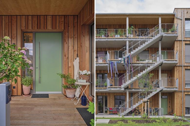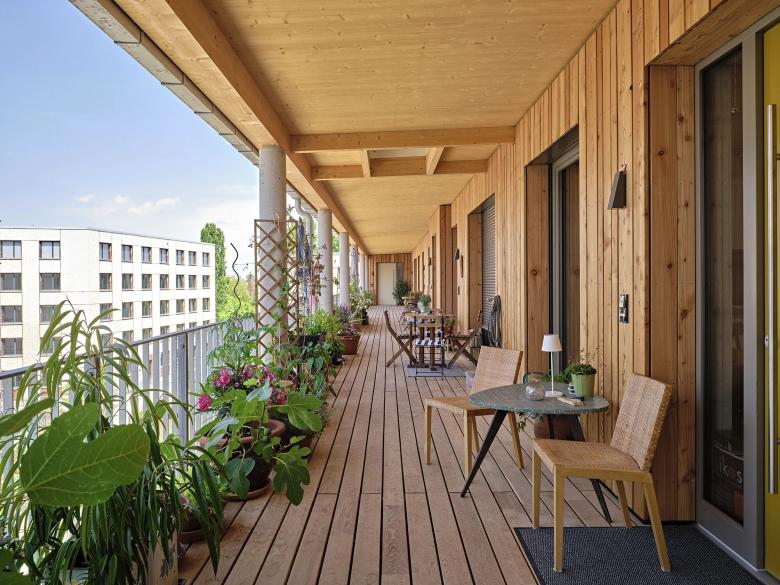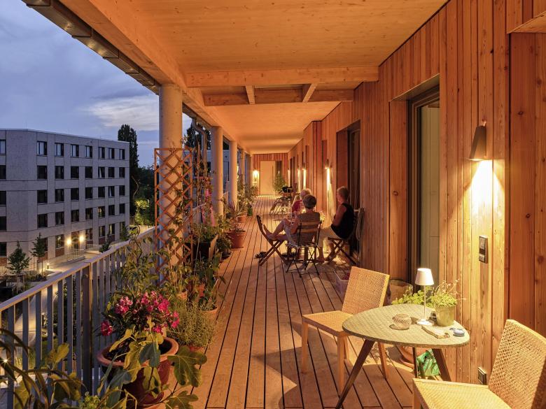 Der großzügige Laubengang auf jeder Etage spiegelt das Miteinander der Bewohner wider. Der Laubengang wird zum Eingang und Außenwohnraum mit Blick auf den innenliegenden gemeinschaftlich genutzten Grün- und Aufenthaltsbereich. Verbunden sind die Laubengänge mit zwei offenen Treppenhäusern.