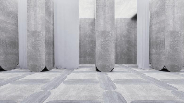 INTRINSIC IMAGINATION AND ART OF FOREIGN AFFAIRS: The Opera Dome Foyer is presented as a part of a series of architectural projects for theatres and other performing arts. Interior design was conceived for The Bolshoi Theatre branch, developed as a part of a big cultural project consisting of The Opera House, the museum of arts, and the music school. The Opera House foyer is a formalistic exemplification of the dramatic atmosphere of the place. Entrance square pillars support the upper tiers of the vertical foyer. Although the design solution of the foyer pillars looks static it holds a hybrid function as a structural supporting element and a stage decoration. Pillars and textiles form a picturesque chain of sky-colored large-scale curtains, thus forming the main foyer space and creating the effect of an additional flexible entrance scene for performances, public arts, and short opening concerts. The foyer's classical deco-design is created as a whole: from the form-giving of the tiles to textiles, the leitmotif of the form is a motion and melodious fluidity.