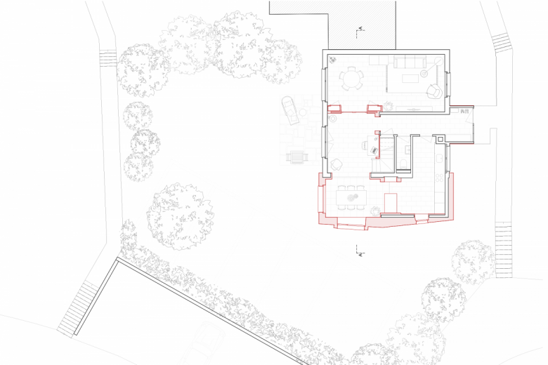 Die nachgezogene Familie wünschte sich die Einhausung des Gartensitzplatzes. Wichtiger als der zusätzlich gewonnene Innenraum per se wog, dass die Küche mit diesem direkt an einem Wohnraum angebunden werden würde. Der Eingriff hat das Haus denn auch auf den Kopf gestellt: an der Schnittstelle von Küche und Wohnen gelegen, ist er heute klare räumliche Mitte der jungen Familie.