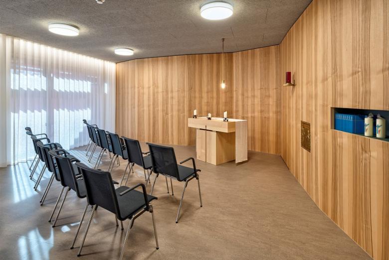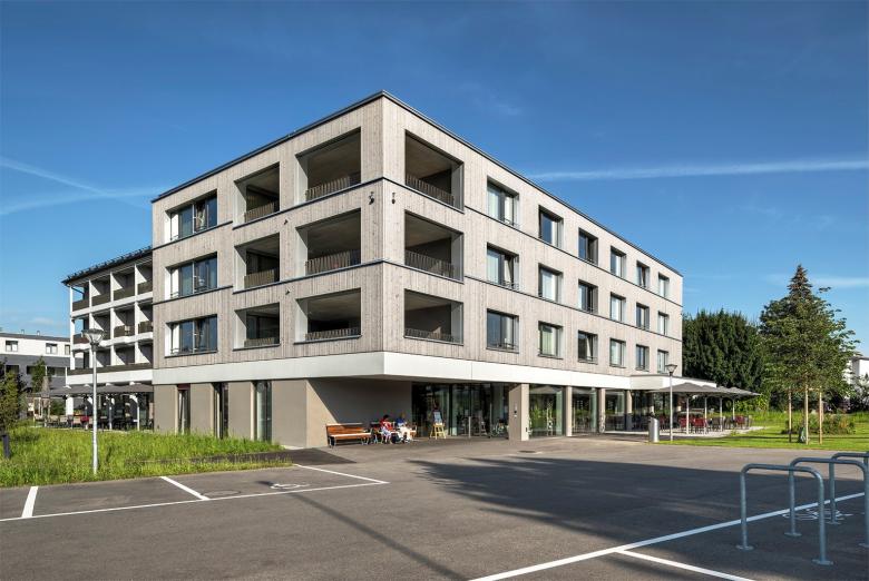 Der neue Erweiterungsbau fügt sich direkt an das Bestandsgebäude an. Durch die Orientierung zur Luzernstrasse öffnet sich ein spannungsvoller Aussenbereich als Zugang- und Aufenthaltsraum. Das Pflegezentrum wird aktiv an das Dorfleben angebunden.