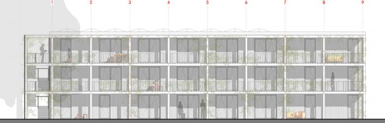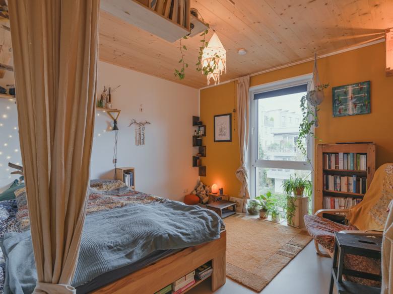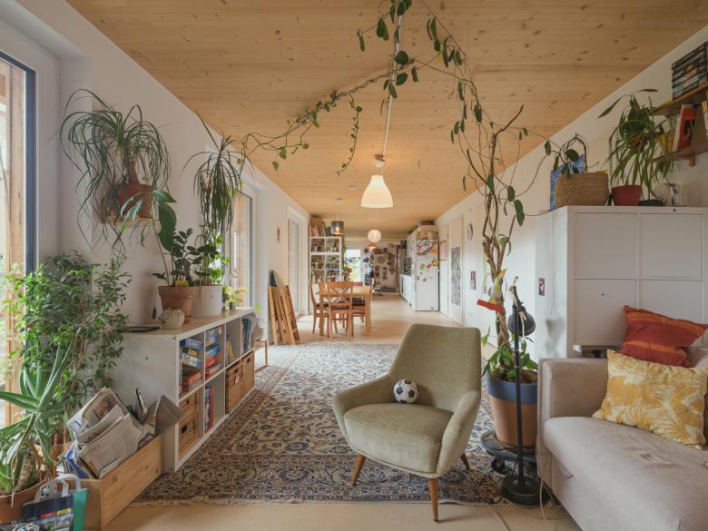 Der Grundriss des Gebäudes besteht auf jedem Stockwerk aus einzelnen Clustern, die unterschiedlich stark autonom sind. Einzelne Cluster sind mit eigenem Bad ausgestattet, andere nicht – diese teilen sich ein Bad mit einem weiteren Cluster. Auf jedem Stockwerk teilen sich die Bewohnenden einen großen Gemeinschaftsraum zusammen mit einer Gemeinschaftsküche. Es entsteht ein Mix aus privaten Rückzugsräumen in den einzelnen Clustern und einer großzügig geschnittenen Gemeinschaftsfläche. Hier wird eine bestmögliche Umsetzung der Idee eines Zusammenlebens vieler Menschen auf wenig Raum angestrebt. Die Begegnungsfläche lädt zum regelmäßigen Austausch ein und macht ein gemeinschaftliches Leben möglich, bei dem etwa Carearbeit zusammen gestaltet und geteilt werden kann.