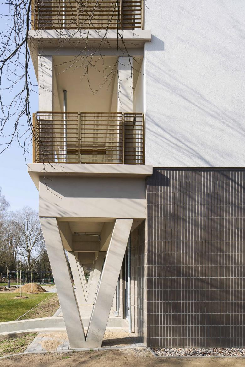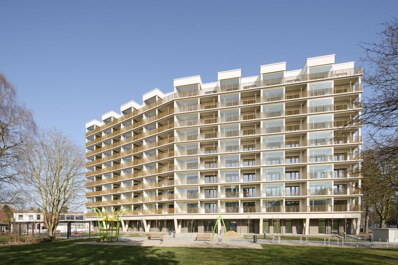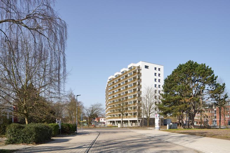 Die Architektur beschränkt sich auf das funktional und konstruktiv Notwendige. Durch ausgewogene Proportionen, Wiederholung, Präzision und charaktervolle Materialien wird eine hochwertige Gestaltung geschaffen. Das Wohnhochhaus hat eine Verwandlung erfahren: Von einer anonymen Gestalt zu einer klaren und zeitgemäßen Formensprache voller Leichtigkeit.