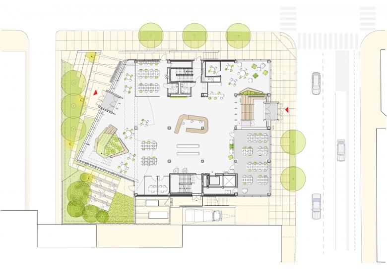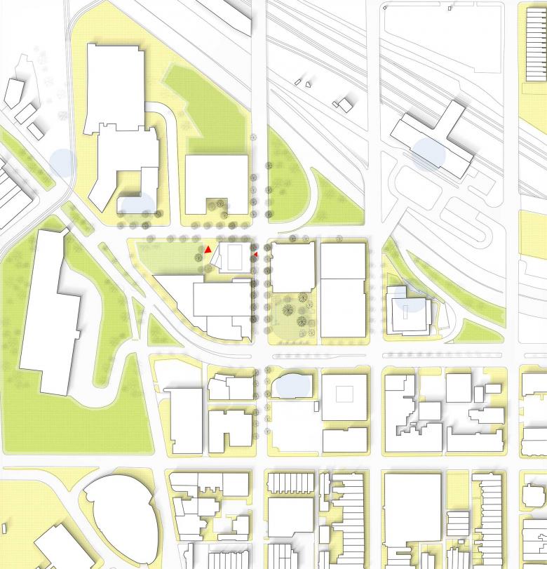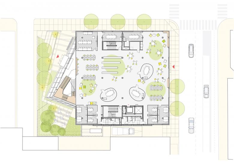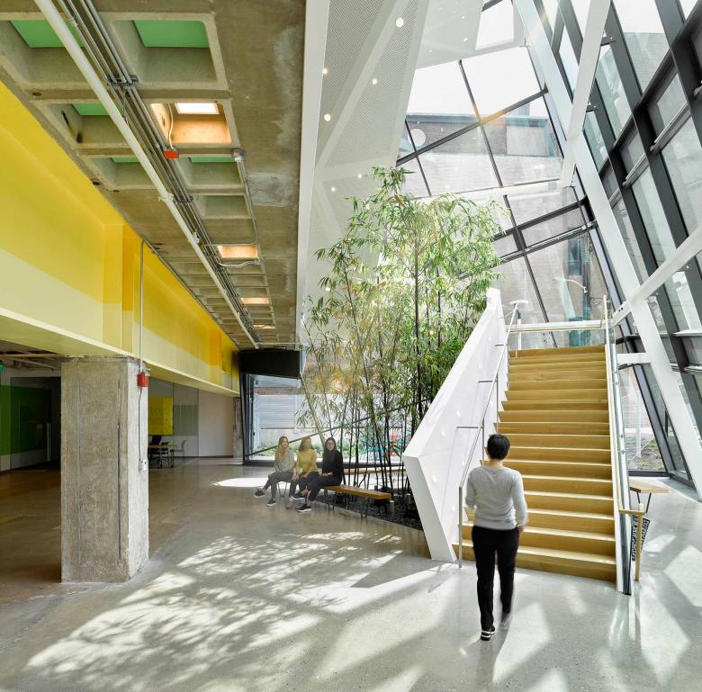 The Glass Hall addition created on the west façade of the original building commands a significant presence along Oliver Street and signals a new intervention in the life of the building. It creates a new entrance on Oliver Street, an important pedestrian link between the newly completed University Bookstore and the John and Frances Angelos Law Center. The Glass hall and the urban plaza that form around its base populates the new pedestrian way with vibrant public amenities that signal the University’s commitment to developing a strong and welcoming urban presence.