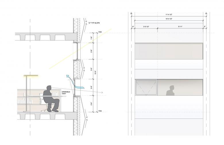 The organization of program spaces on the existing library floor plates places stacked spaces towards the interior zone of the floor, between the cores, to mitigate any impact of sunlight on the printed material. This also preserves perimeter floor space for more regularly occupied functions that are able to take advantage of the daylighting as well as the natural ventilation afforded by the new upgraded façade. Offices, study rooms, and informal work areas that occupy the eastern portion of the building benefit from access to Maryland Street and views toward Penn Station. These spaces along the western façade have direct connection to the new Glass Hall with its ample daylight and open circulation, as well as views west along Oliver Street towards the Fitzgerald Building and MICA. As far as possible, interior partitions are glazed to maximize visual transparency and transmission of daylight.