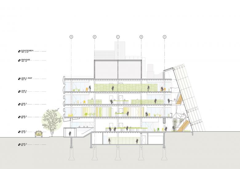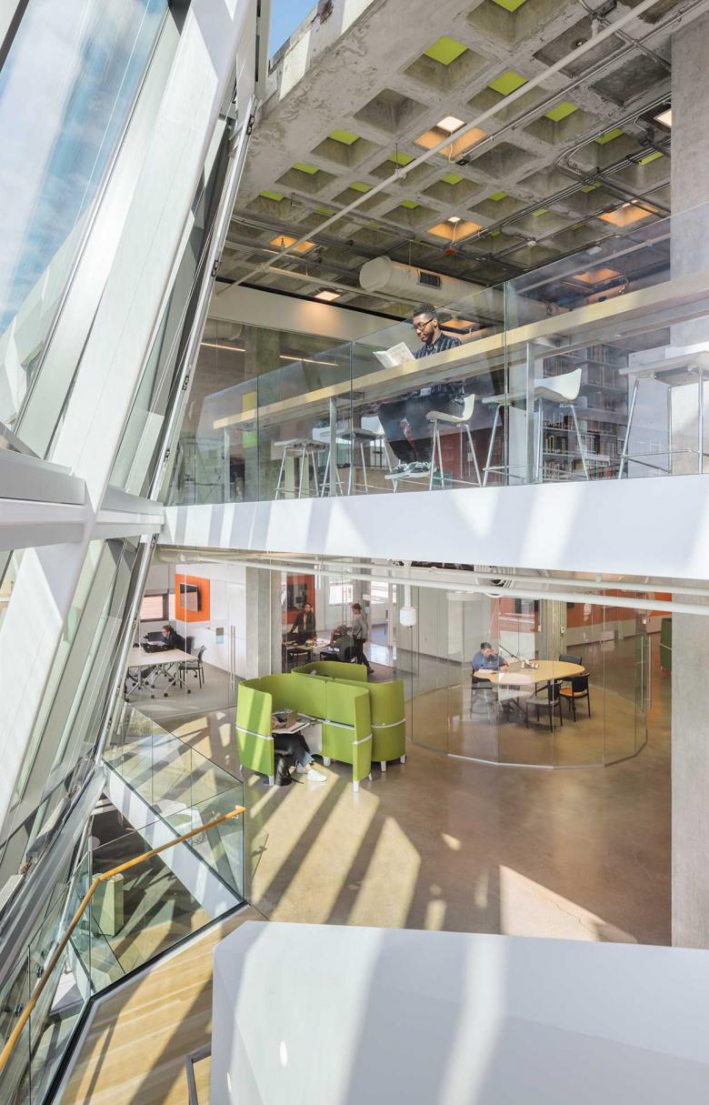 Inside, the Glass hall promotes interior circulation, brings daylight and views into the original floor plate, and creates new informal study and meeting perches within its enclosure. Such spaces reappear on the library floors as well, acknowledging a new era of library use that privileges learning and interaction. With extensive interior glazing and flexible layouts, the life of the library as a key node in the University of Baltimore network can be ensured.