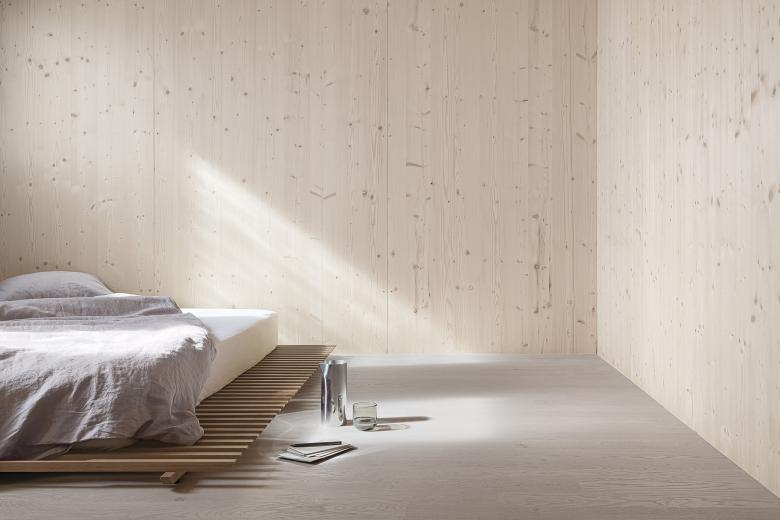 Passend dazu wurde auf der 90 Quadratmeter grossen Wohn- fläche Cleverpark verlegt: «Der Boden sollte wie der Rest des Gebäudes aus Holz gefertigt sein und sich mit seinen nachhaltigen, langlebigen und wohngesunden Eigenschaften in das harmonische Gesamtbild integrieren», begründet Fabio Compagno die Entscheidung für das Parkett. «Die Farbe Eiche Sasso hebt sich dabei leicht von der naturbelassenen Wandverkleidung ab, die Holzmaserung ist nicht zu stark präsent und das Material selbst bietet eine angenehm warme Haptik.» Da das Objekt auch vermietet werden soll und der Bodenbelag daher pflegeleicht und strapazierfähig sein muss, schützt die innovative Versiegelung B-Protect® das Holz zusätzlich – und sorgt dafür, dass die ursprüngliche Anmutung der Oberfläche auch nach Jahren erhalten bleibt.