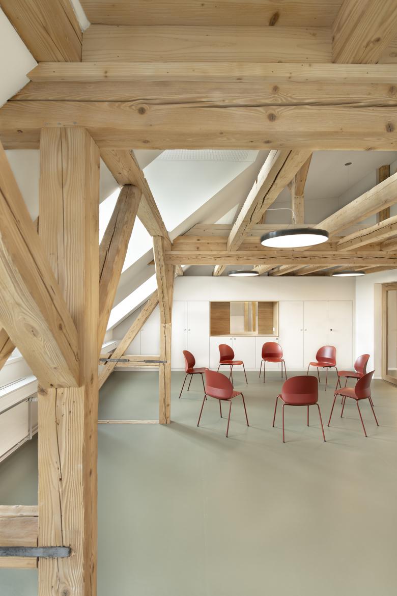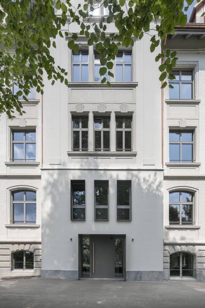 Die historische Bausubstanz wurde erhalten und gleichzeitig eine zeitgemässe, funktionale Schule geschaffen. Im Innenbereich wurden sämtliche Raumaufteilungen an heutige schulische Anforderungen angelehnt. Das Dachgeschoss wurde entkernt, der Dachstuhl ertüchtigt und in unterteilbare Mehrzweckflächen samt Küche transformiert. Die Gebäudetechnik wurde vollständig ersetzt, Dämmung, Beschattungssysteme sowie Statik und Brandschutz wurden zeitgemäss angepasst sowie der barrierefreien Zugang zu allen Geschossen ermöglicht.
