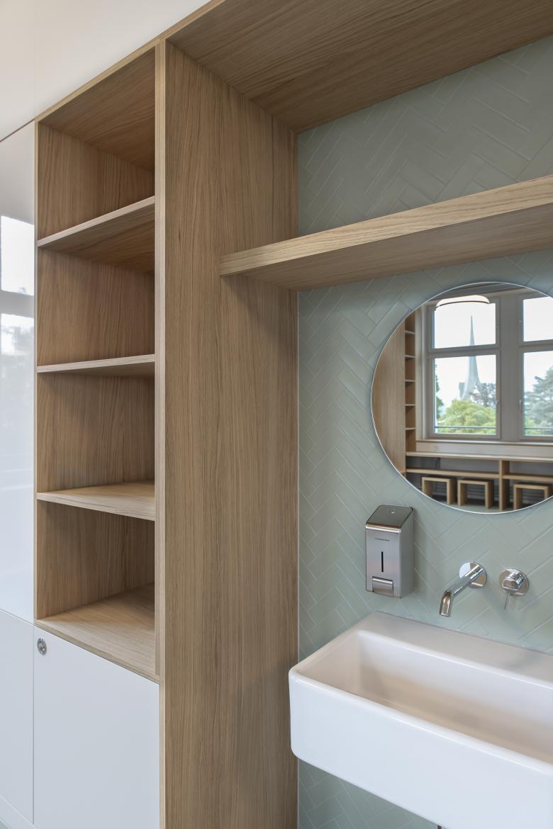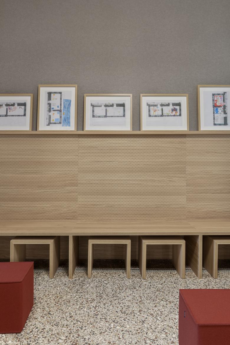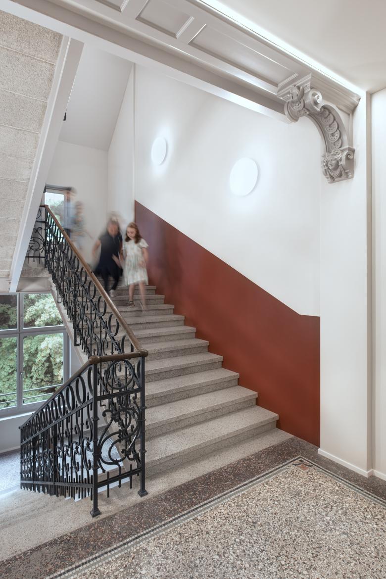Besondere Gewichtung galt auch der denkmalpflegerischen Aufwertung im Innenbereich; im Treppenhaus wurden die historischen Terrazzobeläge freigelegt, ergänzt und aufgefrischt. Das Treppengeländer wurde geltenden Sicherheitsnormen angepasst ohne seinen ursprünglichen Charakter zu verlieren. Die schlichten Einbauten in Eiche, lindgrünen Fliessen und Linoleumböden passen sich zusammen mit den funktionalen Schulmöbeln dem historischen Charakter des Schulhauses an.