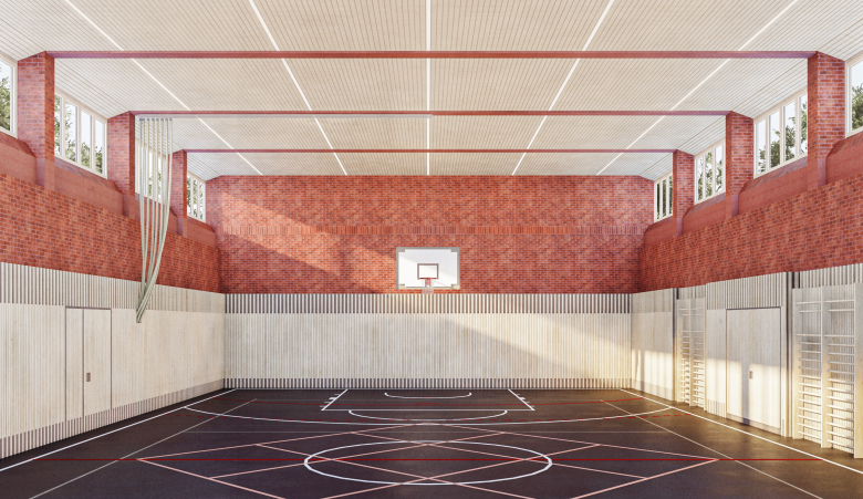 Die Schulsporthalle besteht aus zwei Teilen, einer Einfach- (ca 337qm) und einer 1,20m höher gelegenen Kleinsporthalle (ca 186qm), die auch als Bühne genutzt werden kann. Sie befinden sich in einem gemeinsamen, eingeschossigen Mittelschiff mit Satteldach ohne Zuschauerränge.