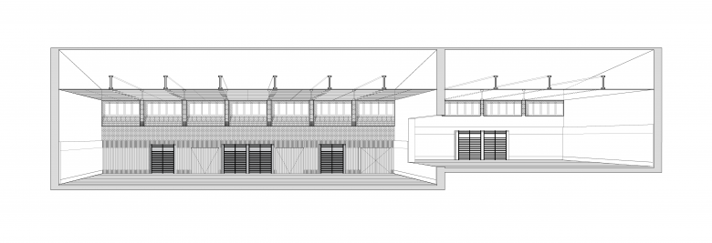 Es soll eine bestandsgerechte Sanierung der Anlage erfolgen. Dies bedeutet unter Berücksichtigung der Bestandssituation und der örtlichen Gegebenheiten ein funktionales sowie wirtschaftliches Konzept. Für die Gestaltung bedeutet dies für uns, charakteristische Merkmale des Bestands aufzugreifen. So wird die Rollschicht in der Ziegelwand in die Gestaltung der Prallwand adaptiert. Die prägende Tragstruktur wird freigelegt und betont, indem die Deckenverkleidung sich zwischen den Betonbindern einfügt und die abgeschrägte Fensterbrüstung wird im Sturzbereich übernommen.