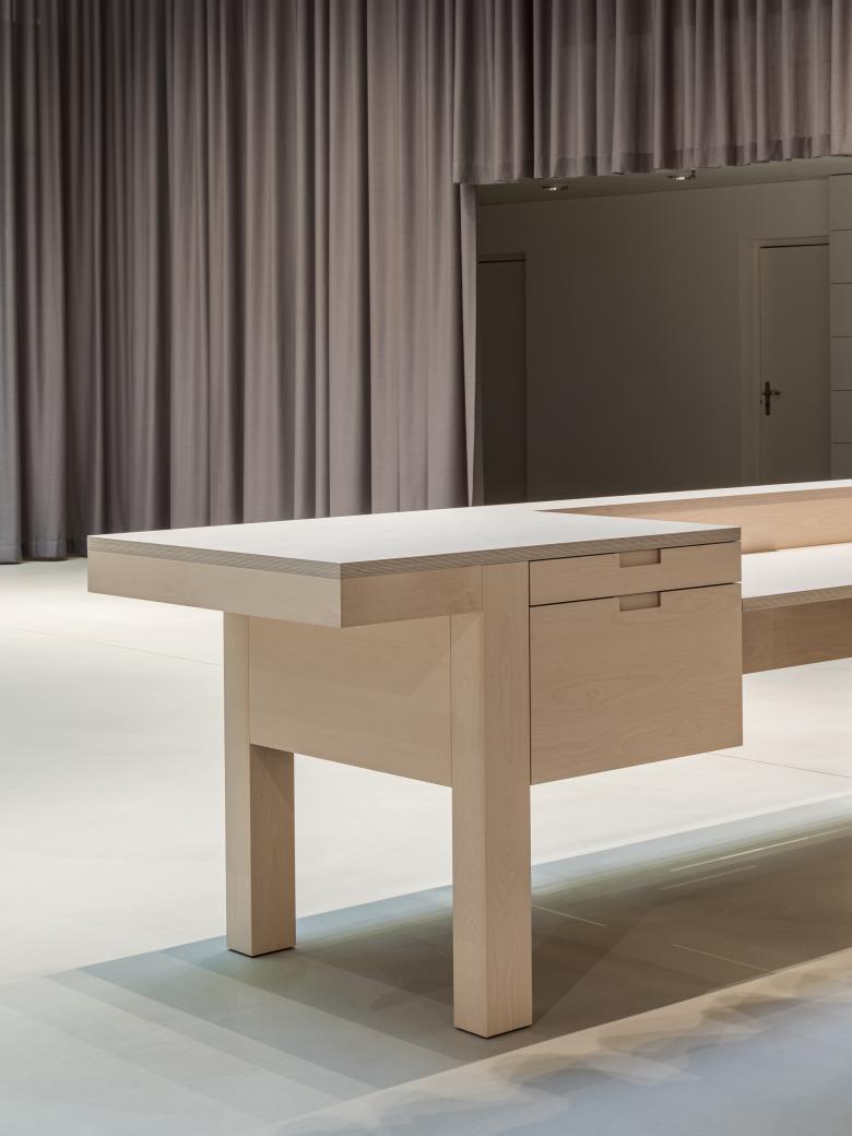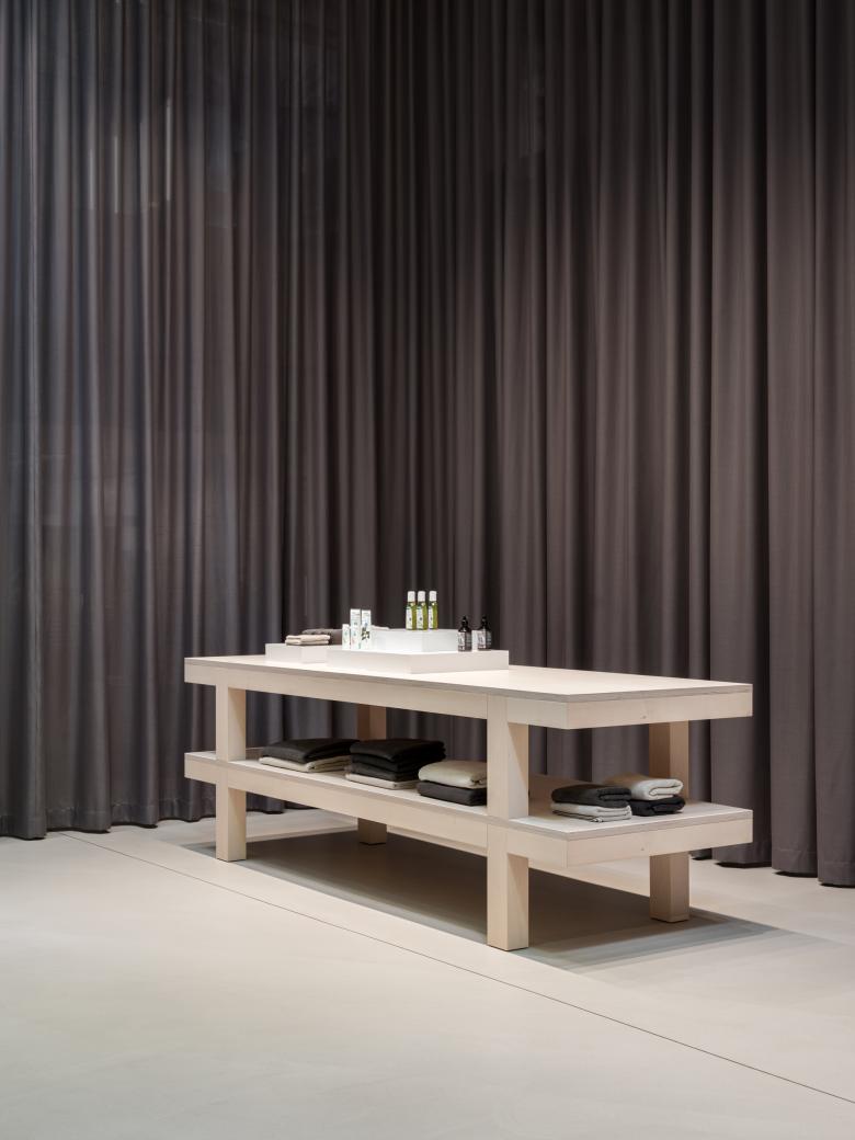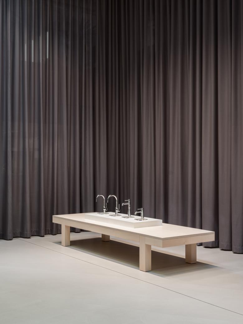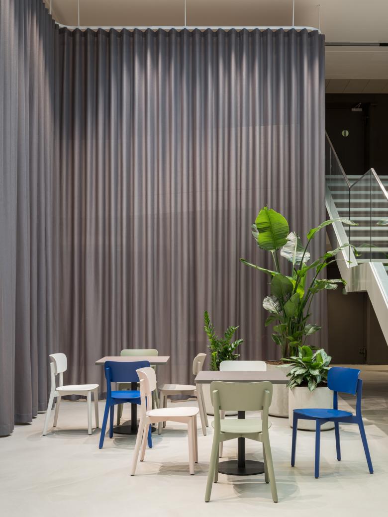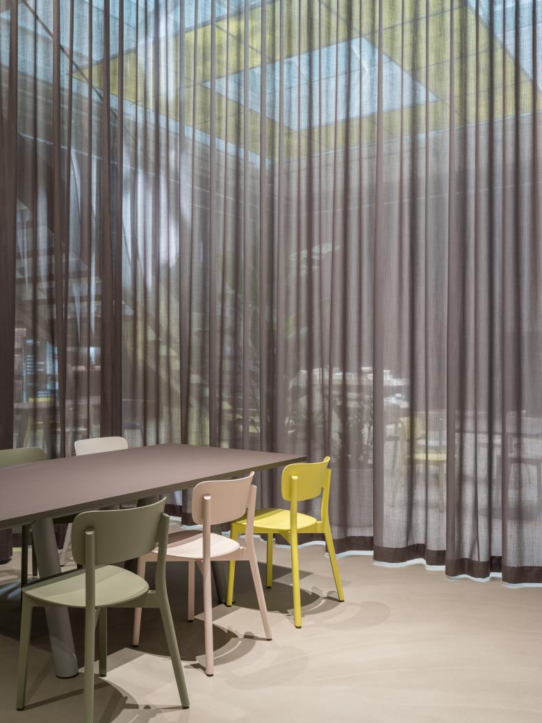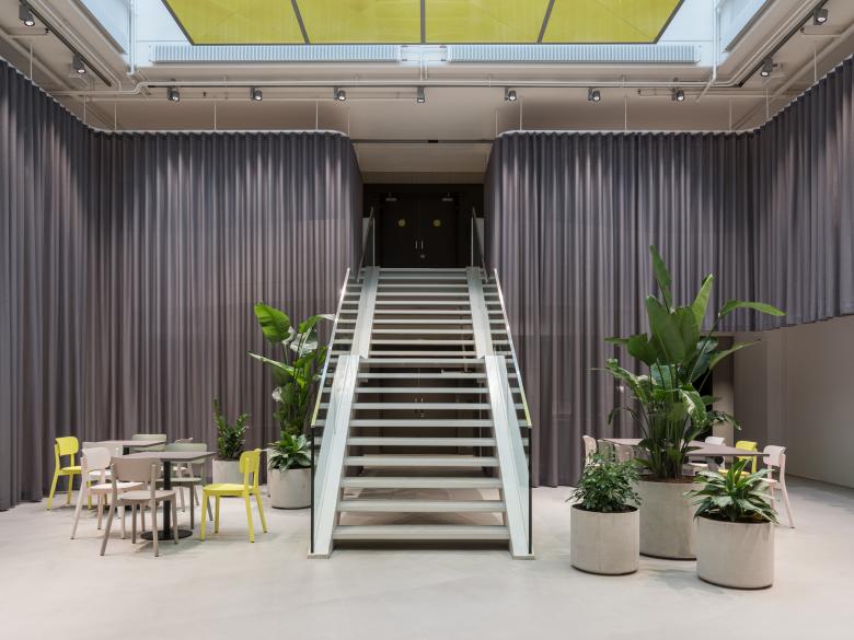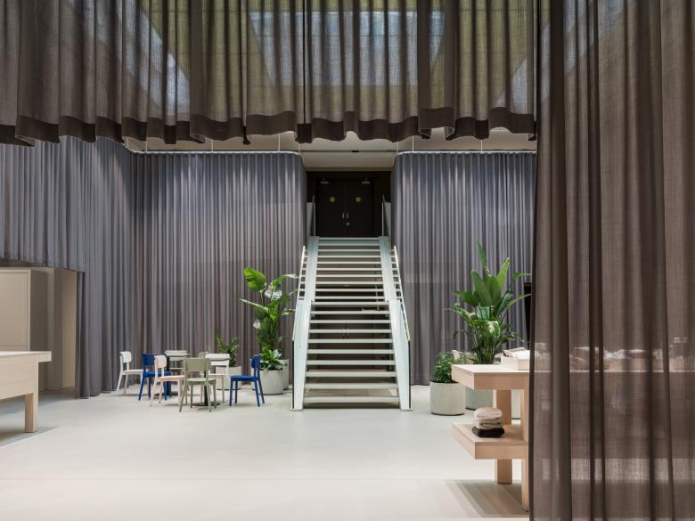 Gemeinsam mit Stephan Hürlemann, der vorgängig das Entwurfskonzept entwickelte, wurde eine Intervention mit grosser Wirkung bei geringer Eingriffstiefe umgesetzt. Ein raumhoher, halbtransparenter Vorhang strukturiert die Fläche, rahmt den Raum und blendet Unwesentliches aus. Mal durchlässig, mal abschirmend, definiert der textile Eingriff klare Wege und schafft differenzierte Zonen.