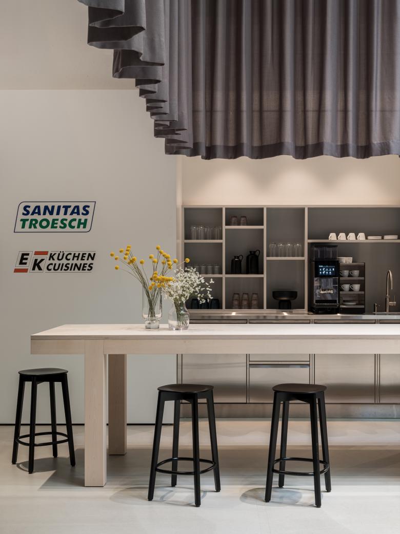 Im postmodernen Carbahaus an der Hardturmstrasse 101 in Zürich präsentieren sich Sanitas Troesch und EK-Küchen gemeinsam mit weiteren Baufirmen auf grosszügigen Ausstellungsflächen. Im Zentrum dieser unterschiedlichen Markenwelten befindet sich der zentrale Empfang von Sanitas Troesch. Ziel des Projekts war es, die bisher unübersichtliche Situation zu ordnen und einen einladenden Ort des Ankommens mit starker gestalterischer Präsenz zu schaffen.