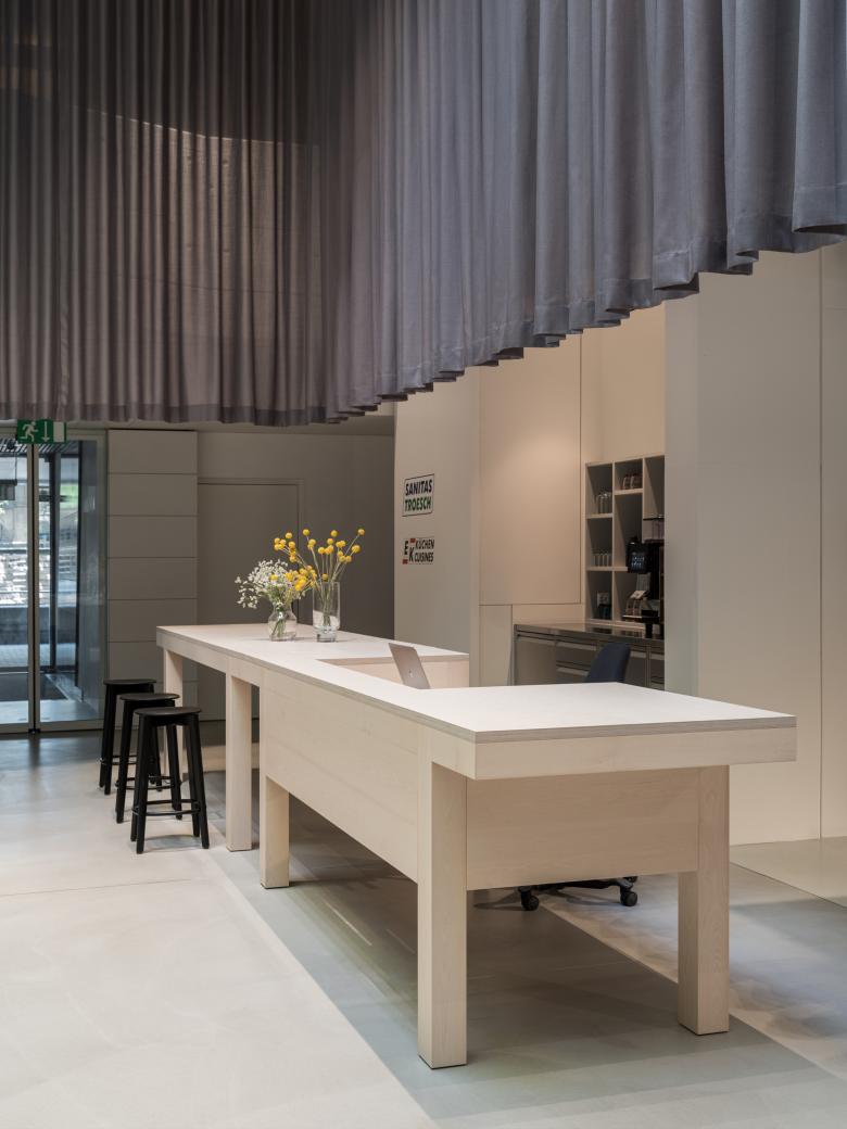 Das neue Empfangsritual von Sanitas Troesch wird erstmals im Rahmen des neuen Ausstellungskonzepts pilotiert. Besuchende werden am Bartresen mit einem Kaffee begrüsst, direkt daneben befindet sich ein Empfangstresen mit integriertem Arbeitsplatz. Die von dopo entworfenen Möbel orientieren sich formal am Ausstellungskonzept und verleihen der Empfangssituation eine offene und einladende Atmosphäre.