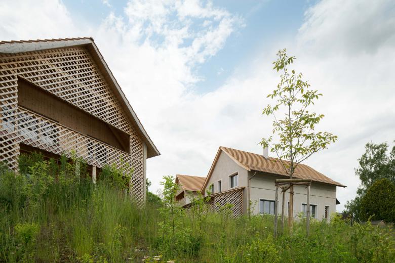 Umfasst werden die Häuser von einem Einsteinmauerwerk (Ziegelstein mit Lufteinschlüssen), und einem dicken Kalkputz. Förmlich in das Mauerwerk hinein ist ein Holzbau gesetzt. Die Anordnung der Volumen, die Materialisierung mit Kalk und Holz und einem langsam wachsendem Naturgarten ergeben ein stimmungsvolles Gesamtbild in der ISOS geschützten Dorfzone von Nussbaumen.