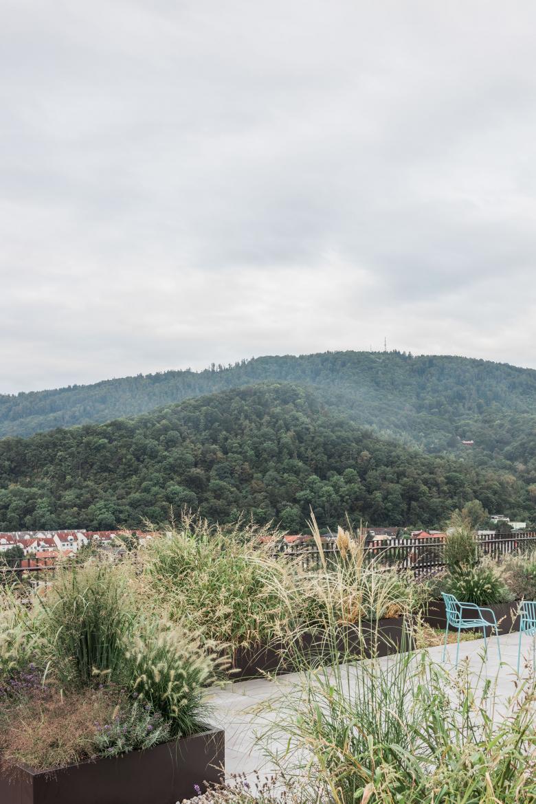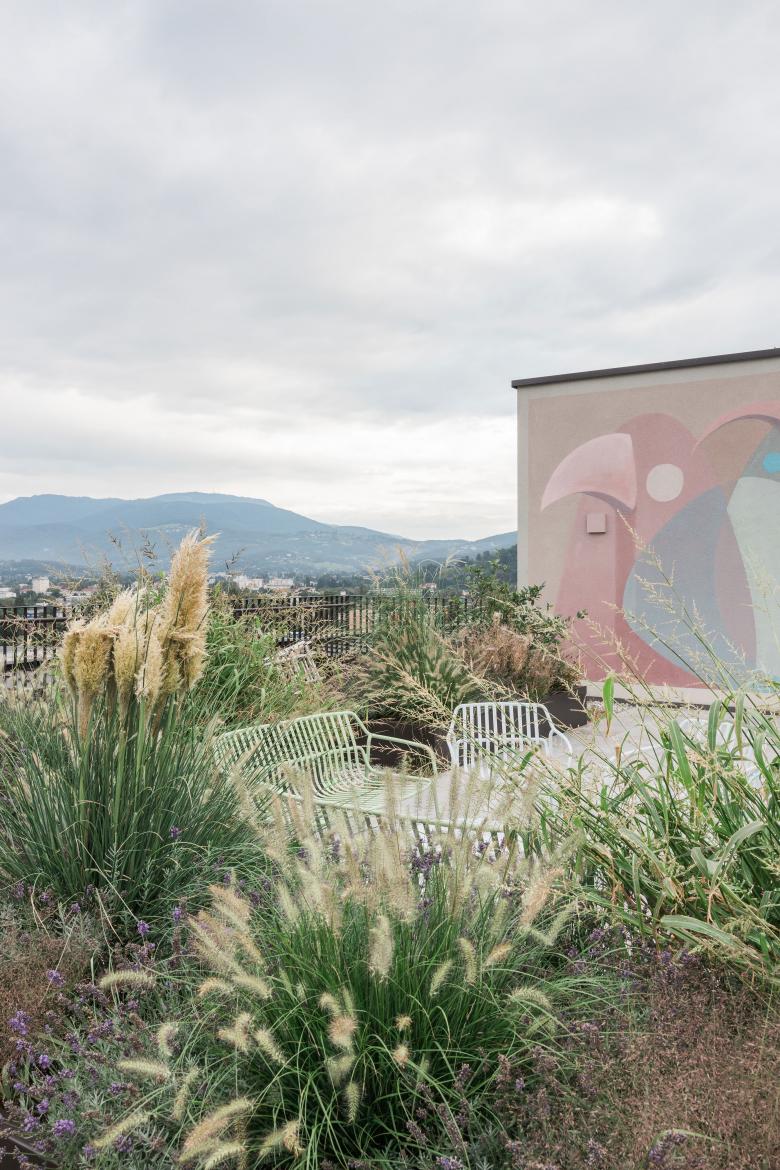 Die dahinter verborgene Dachterrasse ist beliebter Treffpunkt. Allgemein zugänglich, fördert sie die kommunikativen Ambitionen der Nutzer*innen.