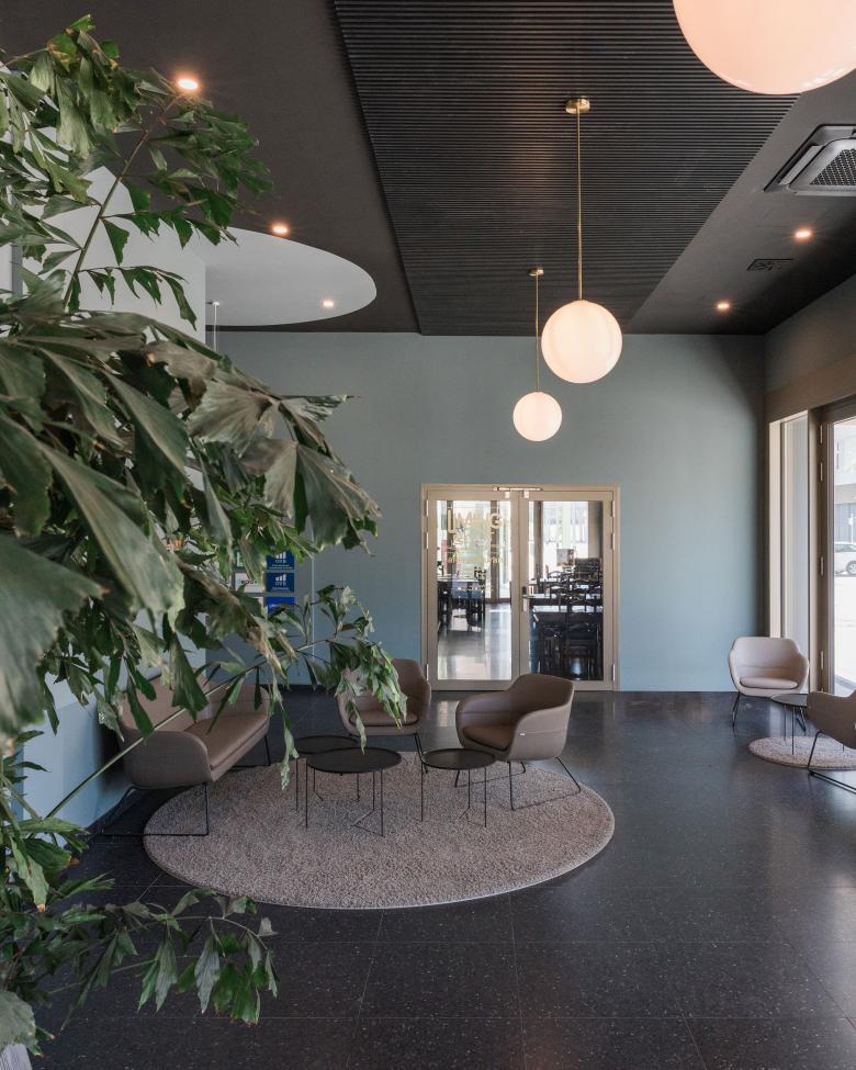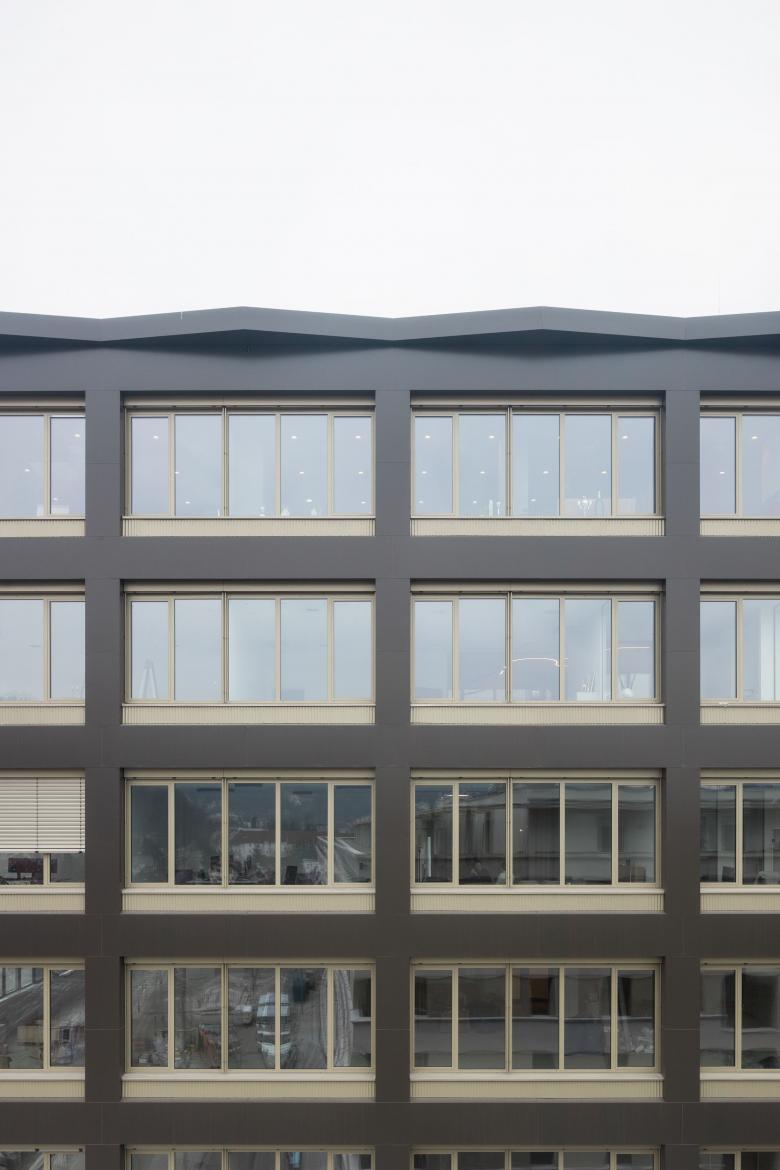Die Fassade wird rundum einheitlich ausformuliert und klassisch gegliedert, Erdgeschoss, Regelgeschoss und Attika. Die Gliederung erfolgt subtil, ohne den gewählten Farbkanon zu verlassen. Dem öffentlicheren Charakter der Erdgeschosszone mit seinem gastronomischen Angebot entsprechend, erhält die Fassade hier eine umlaufende „Markise“. Diese auskragenden metallischen Volumina bieten eine Art schützendes Dach im öffentlichen Raum, eine Geste, die man bevorzugt in italienischen Städten antrifft. Die Fassade der Regelgeschosse achtet auf ein ausgewogenes Verhältnis zwischen Rahmung und Öffnung. Zwei Farben, ein dunkler schwarzbraun Ton und ein glänzender Messington mit leichten strukturellen Differenzierungen unterstreichen diese Kontrastierung. An der Attika schafft ein auskragender Fries einen räumlichen Abschluss nach Oben und damit ein starkes dekoratives Element der Identifikation.