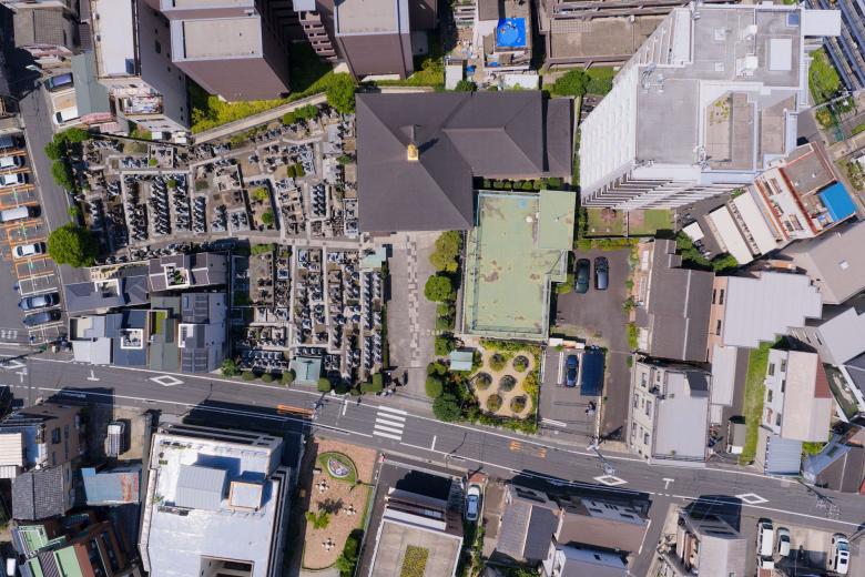 都市部にある寺院をGoogle mapの航空写真で見ていると敷地に占める墓地の大きさが境内に比べると遥かに大きいことに驚かされることは少なくない。広大な墓地が寺院境内を圧迫、その聖域性に影響を与えていることは想像に難くない。ズームインすると、整然と並ぶ区画の中に所々墓じまい等による空白があり、まだらになっていることが確認できる。ストリートビューでその周辺を見れば、その多くは条例の影響で長大な塀として現れ、街並みに少なからず圧迫感を与えている。