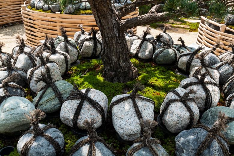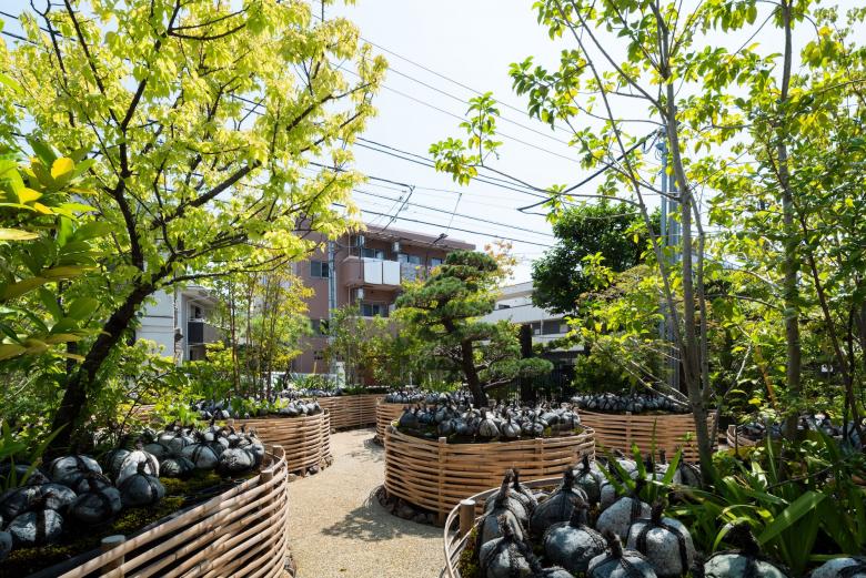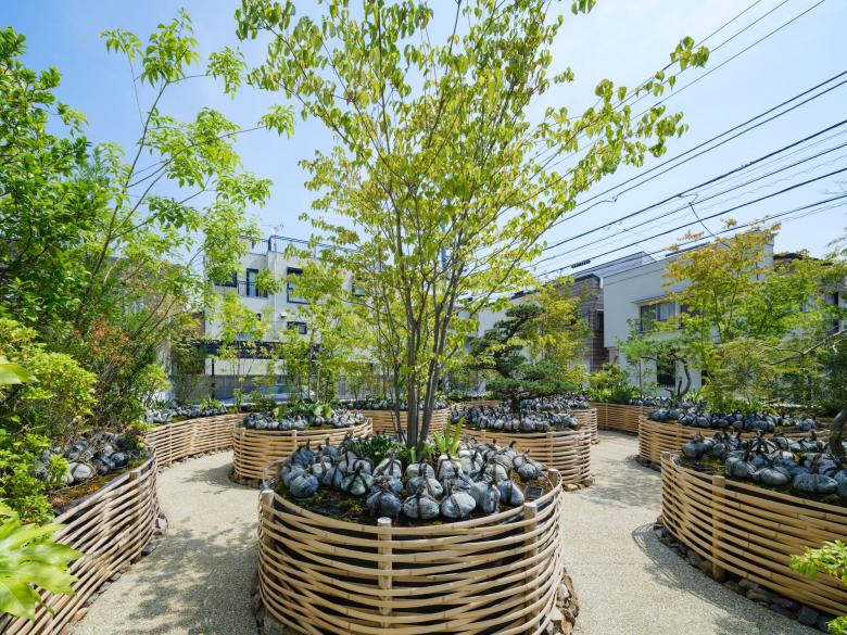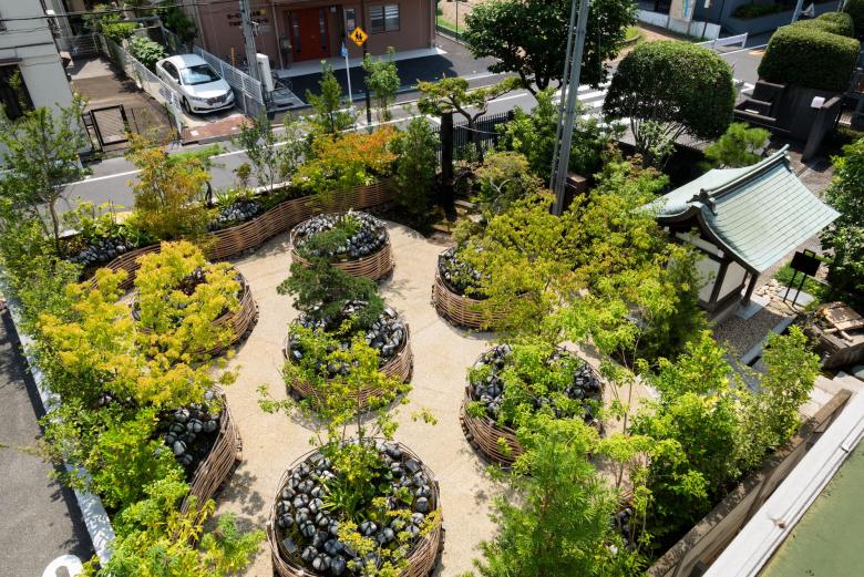 伝統寺院は本来その伽藍配置と付属する庭園や参道、そして結界を暗示する緑地、段差、門、扉、柵、灯籠や手水鉢等添景物を重層化することによって奥行きをつくり、空間的聖域性を維持してきた。都市部にある寺院は都市化による敷地の減少、墓域の拡大によって聖域性を維持するのが難しくなってきている。そこで『想盆』は墓地ではあるが伽藍に付属する回遊式庭園として計画することにした。苔蒸した飛び石のアプローチや縄が架けられた2対の石柱が境内/墓域の結界になり、シュロ縄で十文字に縛られた関守石による墓石が、関守石より上の草木で覆われた「生」の世界/関守石より下のカロート=「死」の世界の結界になり、結界が重層化している。各樹木葬の柵はしなやかで折れにくい竹の力学的特性を利用したしがらみ竹でできていて、傷んだ割竹は随時手入れをし続ける必要がある。しばしば交換したばかりの真緑の割竹が所々まばらに見えることになり、『想盆』はひと時として同じ姿であることはない。