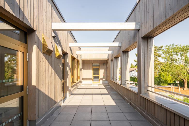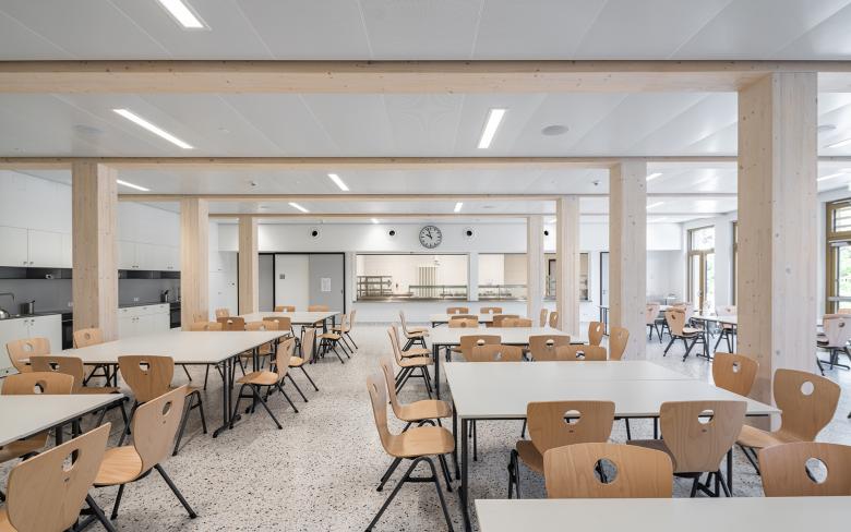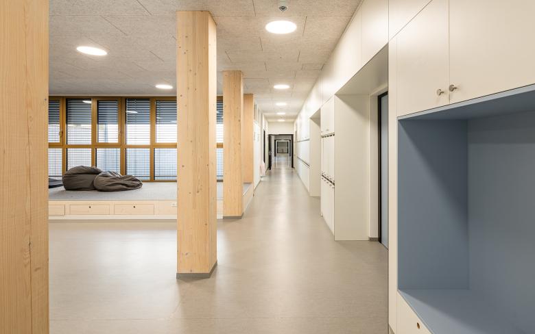 Ein zentraler Bereich in Stahlbetonbauweise verbindet die Gebäude. Die Unterrichtsbereiche wurden aus vorgefertigten Holzelementen errichtet. Die Clusterstruktur ermöglicht eine klare funktionale Gliederung, die auch brandschutztechnisch separat organisiert ist.