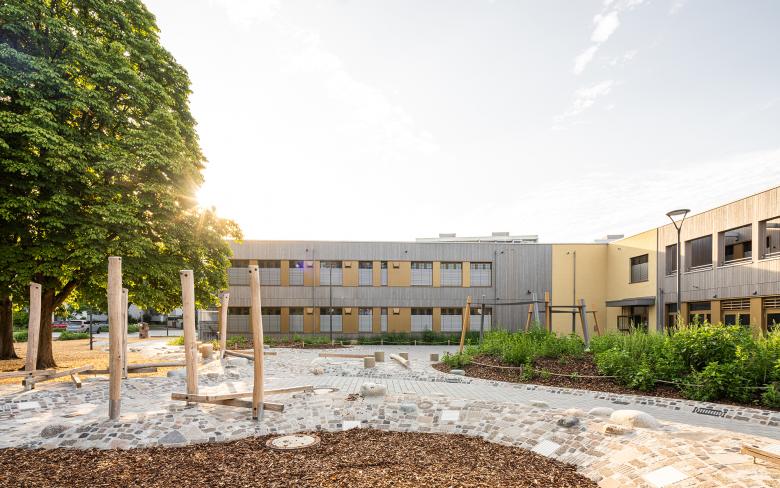 Die städtebauliche Einbindung berücksichtigt das bestehende Wohnumfeld. Alte Baumbestände, darunter drei große Eichen, wurden erhalten und in den Pausenhof integriert. Farblich differenzierte Lerncluster schaffen Orientierung im Gebäude.