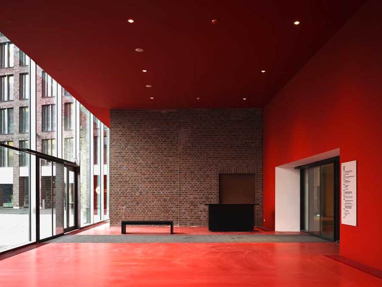 Mit der neuen „Vertikalen“, einem über alle Geschosse geöffneten Erschließungsraum zeigt sich das Bauvolumen des „U“ erstmals in seiner ganzen Größe auch im Innenraum. Rolltreppen führen vom Foyer im Erdgeschoss vorbei an allen Ausstellungsebenen bis hinauf in den „Kathedralenraum“ direkt unter dem leuchtenden U. Raumdurchdringungen von innen nach außen in Form konisch verzogener, metallverkleideter Kubaturen sind kontrapunktisch zu den vorhandenen roten Klinkerfassaden formuliert und verweisen auf die besondere Dachform des „Kathedralenraums“.