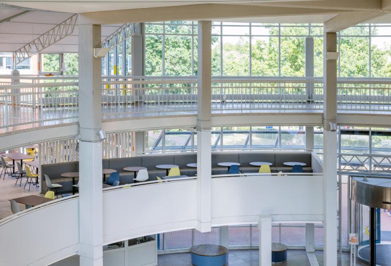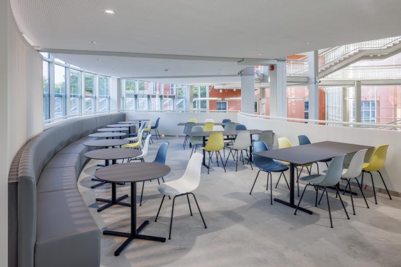 Die rund 100 Sitzplätze für die Besucherinnen und Besucher befinden sich auf der Galerie in der vorgelagerten Eingangshalle – der sogenannten Rotunde. Der neu gestaltete Gastronomiebereich schafft mit einem modernen Möblierungskonzept und farbigen Akzenten eine angenehme Atmosphäre zum Entspannen und Verweilen. Eine moderne Essensausgabe bildet die Schnittstelle zwischen dem öffentlichen Bereich und der Großküche. Im Zuge der Maßnahme wurde die bestehende Galerie baulich erweitert, eine Brücken-Anbindung geschaffen und die vorhandene Aufzugsanlage ertüchtigt.