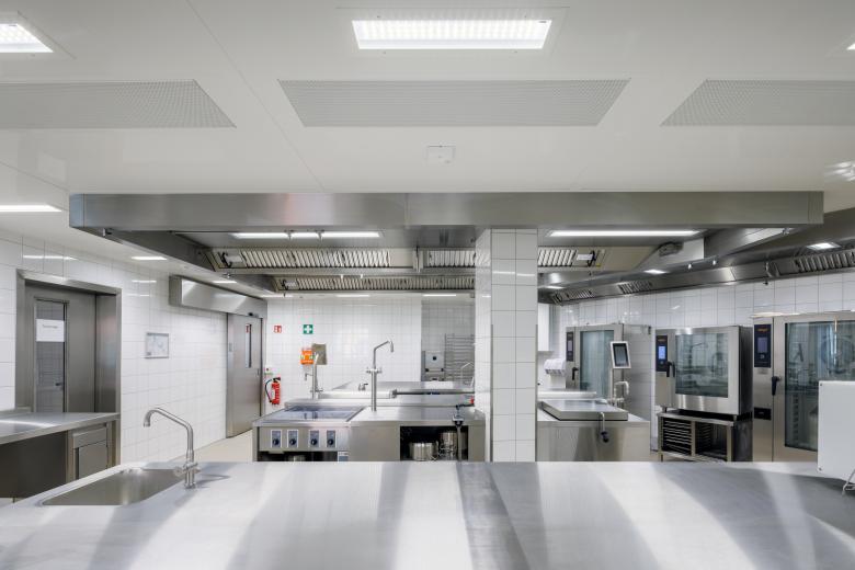 Nach über 25-jähriger Nutzung wurde die abgängige Küche der DASA von Grund auf modernisiert und baulich erweitert. Ziel war es, den Betrieb an die heutigen technischen und hygienischen Anforderungen anzupassen. Hierzu wurde die Küche im südlichen Bereich um einen zweigeschossigen Anbau mit Anlieferung im Erdgeschoss und Lagerräumen im Obergeschoss erweitert. Die moderne neue Großküche wurde nach dem „Cook & Chill“-Konzept geplant. Täglich können hier 300 Essen – bei Veranstaltungen sogar bis zu 500 Essen – ausgegeben werden. Das Raumangebot umfasst verschiedene Lagerbereiche, Personalräume, Sanitäranlagen sowie eine Spülküche.
