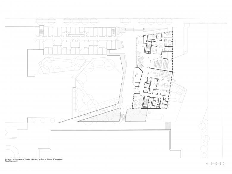 The VLEST is designed to serve as a gateway to the campus, bridging the height difference between Walnut and 32nd Streets. It introduces a plaza deck, creating a pedestrian link between Walnut Street and the Palestra, the university's historic basketball arena, while also connecting with Shoemaker Green. The building includes high-performance labs, office spaces, and collaboration areas, with double-height spaces fostering interaction. The labs are strategically placed along the eastern facade, offering views of the Schuylkill River. The building incorporates a range of passive design strategies, such as operable windows for natural ventilation and a high-efficiency heat recovery system to reduce energy use.