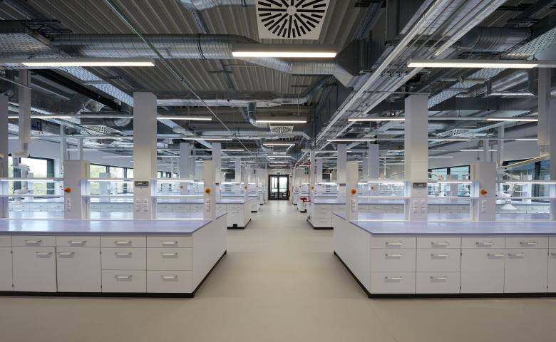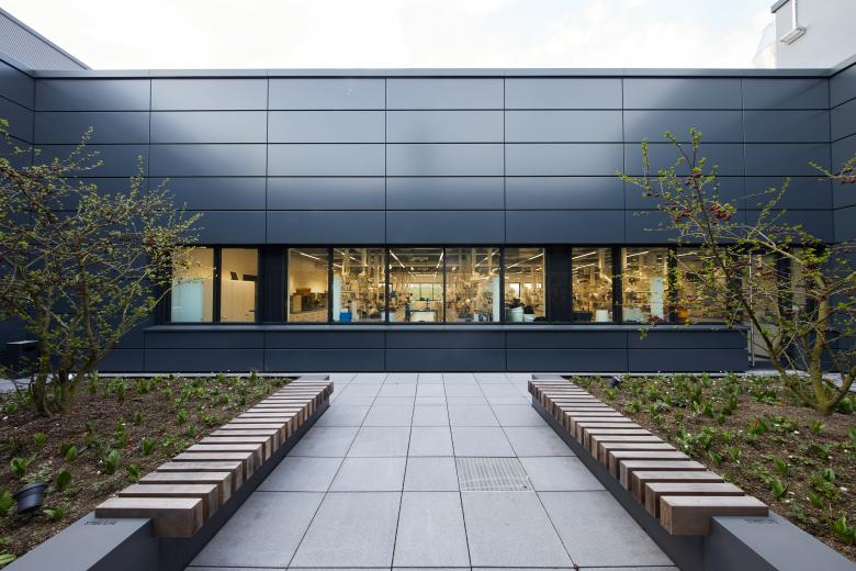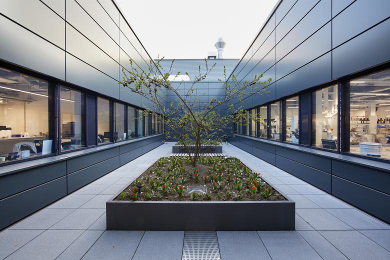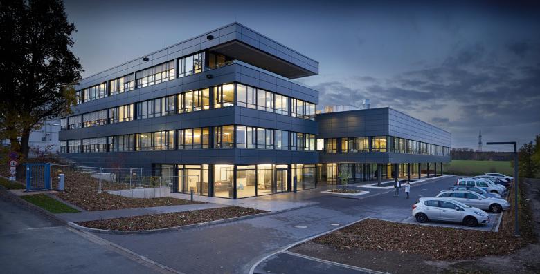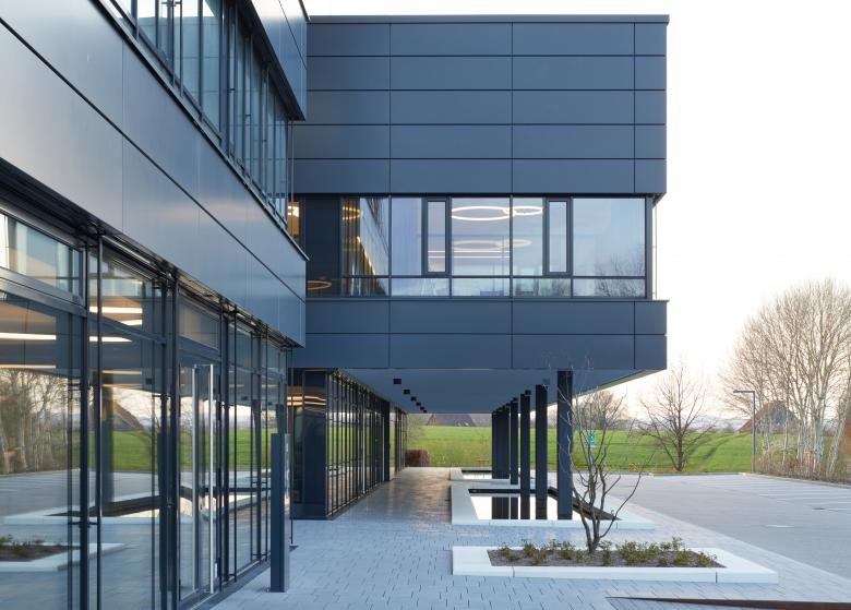 Die verschiedenen Funktionsbereiche sind auf zwei Baukörper verteilt: einem viergeschossigen Büro- und einem zweigeschossigen Laborgebäude, die durch zwei Brücken miteinander verbunden sind. Durch die starke Hanglage verschwindet das Erdgeschoss im Westen komplett in der Erde. Das erste Obergeschoss schließt hier höhengleich an das vorhandene Betriebsgelände an. Besucher und Mitarbeiter in der Verwaltung betreten den Komplex über den Hauptzugang am östlichen Ende des Bürogebäudes. Für die Mitarbeiter in den Laboren gibt es einen separaten Eingang.