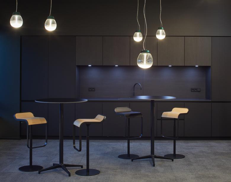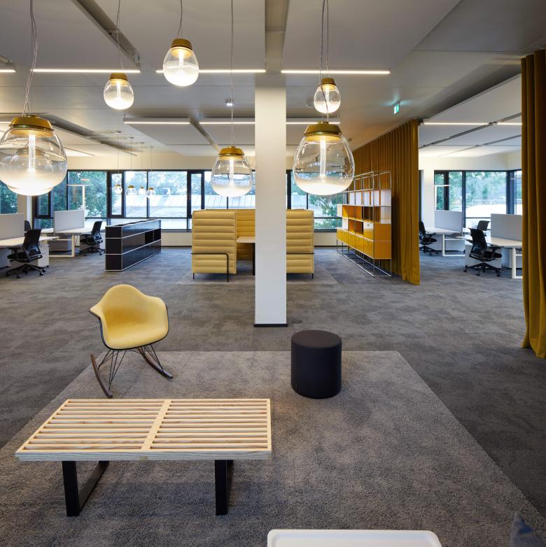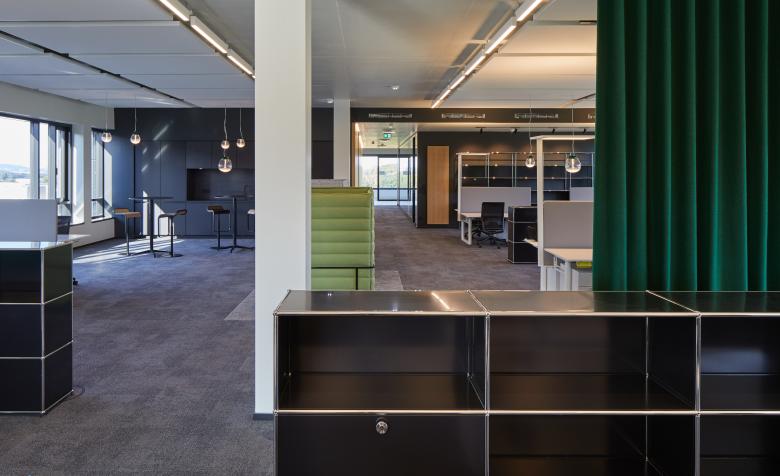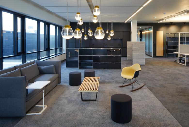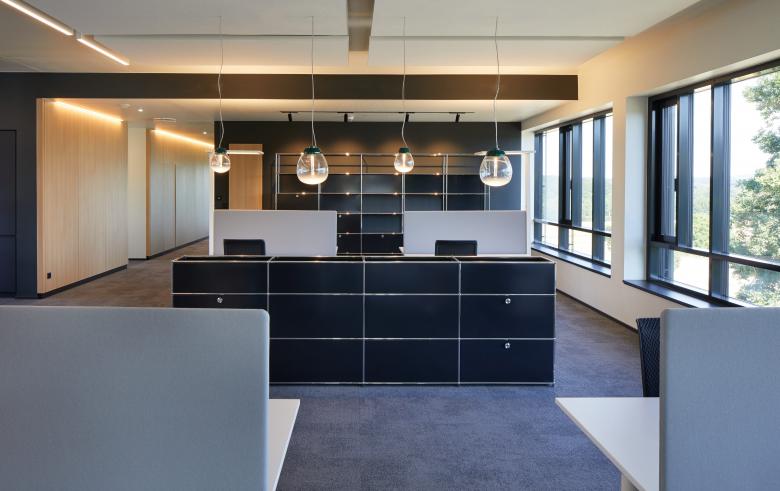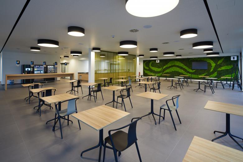 Die Arbeitsplätze in der Verwaltung sind auf drei Ebenen in offenen Bürolandschaften organisiert. Auf jeder Etage ermöglichen Desk-Sharing- Plätze, Teeküchen und Lounge-Bereiche interaktives und kollaboratives Arbeiten und bieten höchst attraktive Arbeitsumgebungen. Neben Bereichen für interaktive Kommunikation ermöglichen zentral gelegene geschlossene Besprechungsräume auf jeder Etage akustisch abgeschirmte Meetings.
