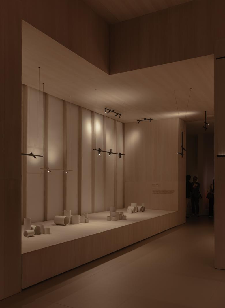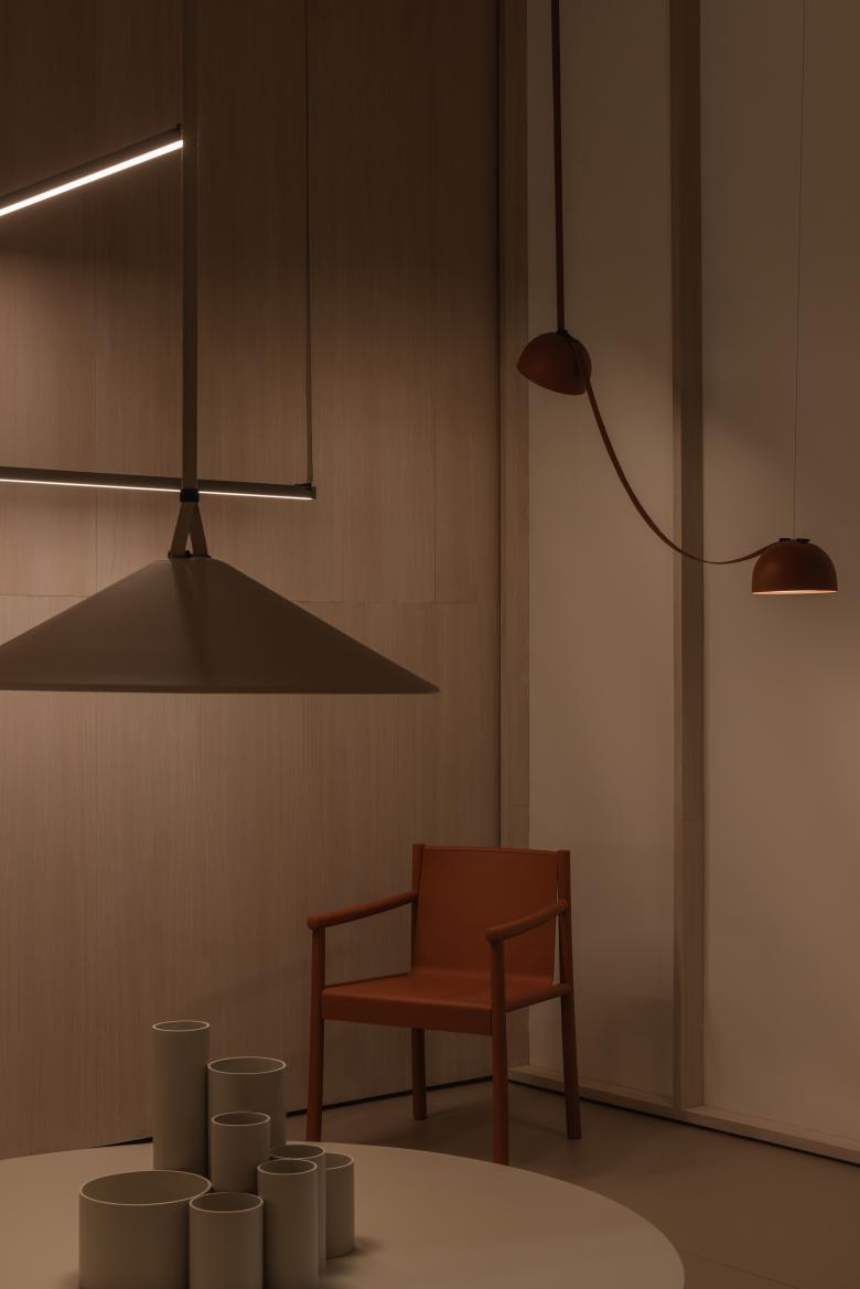 El proyecto utiliza materiales cálidos como la madera roble blanqueado y un lenguaje geométrico preciso para dialogar con las cualidades de la luz: su capacidad para modelar, insinuar, desaparecer. Un marco desde el cual entender la dimensión emocional de cada una de las luminarias.