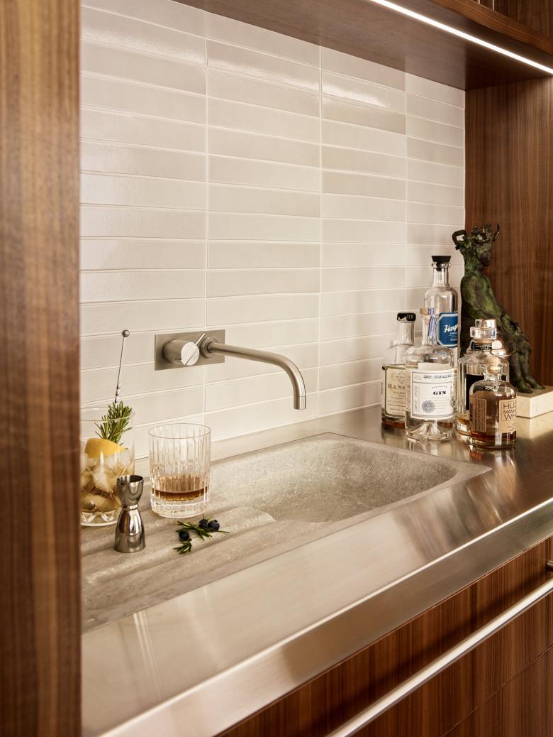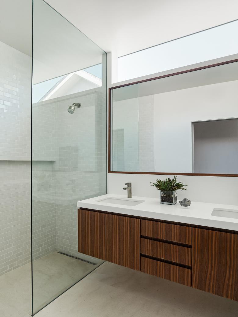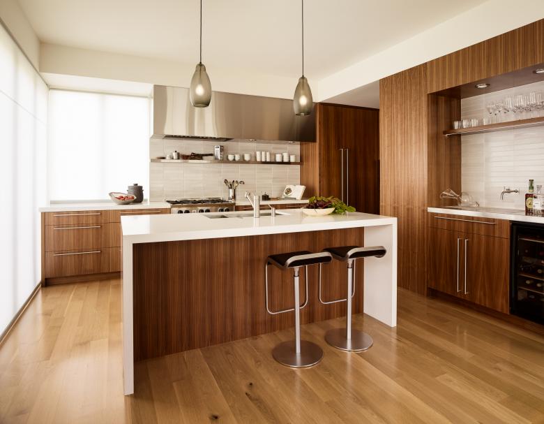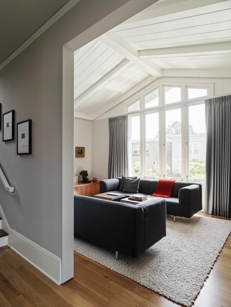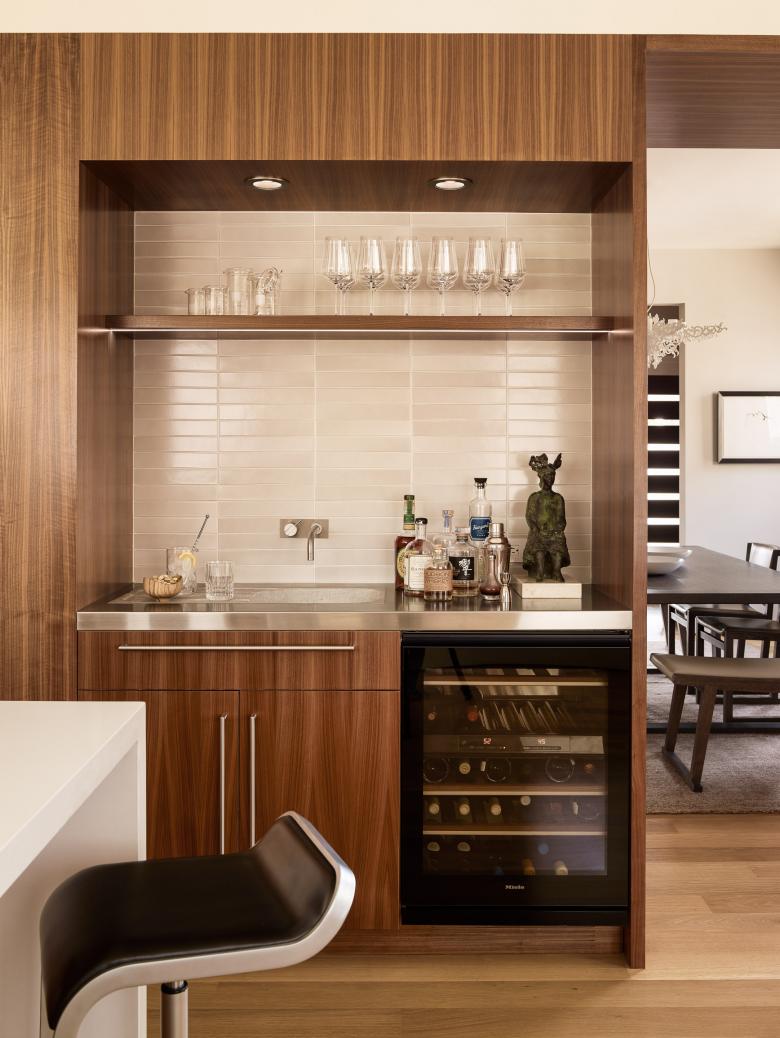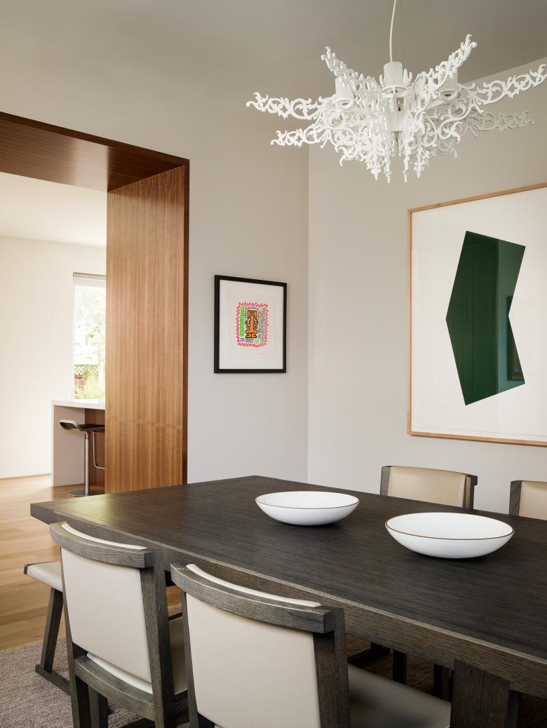 On a residential street in San Francisco’s sleepy, friendly West Portal neighborhood, a small residence becomes a warm, refined oasis. Custom millwork of rich, vertical-grain cherry wood and flooring made of golden oak line the entire interior, carefully threading spaces together. In the kitchen, the cherry wood marks cabinets and drawers, and even the underside of a stark-white melamine island that choreographs movement through the space. Moving toward the adjacent dining room, the cherry wood makes a graceful appearance as the thin edge of the deep threshold that links the two spaces.