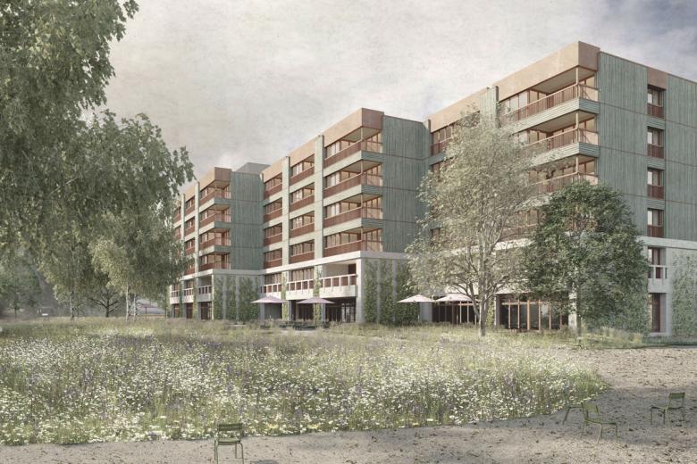 Das Alterszentrum kommt an den Rand des geplanten neuen Stadtparks zu liegen. Entlang der gestaffelten Fassade öffnet sich der Grünraum von der Strasse her in die Tiefe. Rückseitig knüpft der Neubau an die orthogonale Quartierstruktur an. Das Erdgeschoss mit Restaurant sowie ein Mezzaningeschoss für die Pflegezimmer treten an der Fassade als doppelgeschossiger, mit Betonelementen verkleideter Sockel in Erscheinung. Darüber erheben sich viergeschossig die in Holz materialisierten Alterswohnungen.