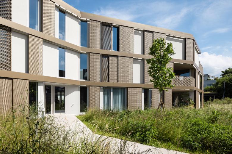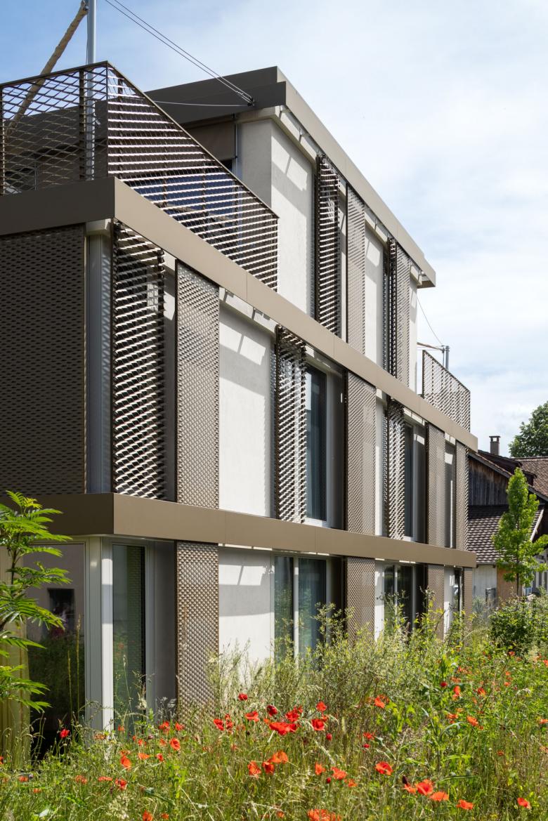 Das Mehrfamilienhaus nahe dem Zentrum von Therwil beherbergt zehn Wohnungen auf zwei Vollgeschossen und einem Attikageschoss. Die gewählte Form mit Versatz und zwei geknickten Längsseiten integriert sich gut in die Umgebung und schafft zwei vielseitig nutzbare, gut proportionierte Aussenräume. Die Verbreiterung des Volumens gegen Süden markiert den Abschluss zu den beiden vorhandenen Strassen. Das zentrale Treppenhaus mit Lift ist von zwei Seiten zugänglich und verbindet die beiden Aussenbereiche miteinander.
