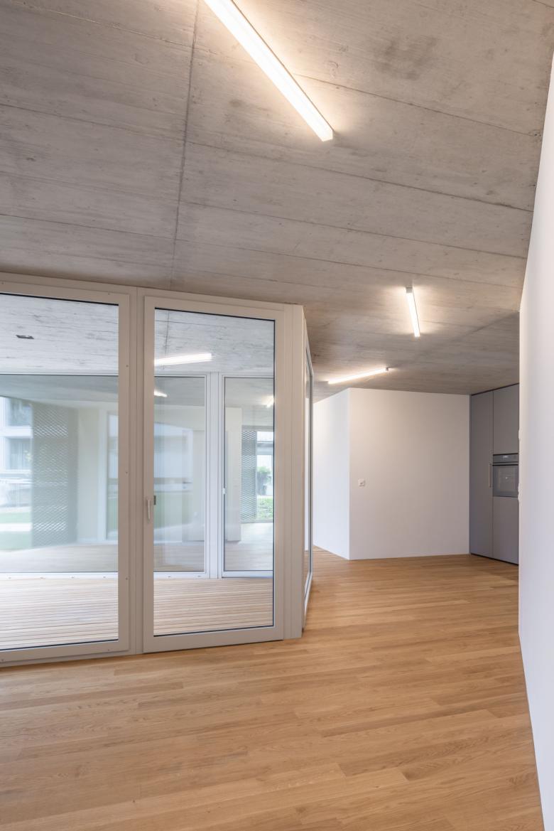 Durch die geschickte Setzung des Baukörpers sind alle Wohnungen auf mindestens zwei Seiten hin orientiert. Sie sind charakterisiert durch eine „promenade architecturale“, bei der sich die Gänge zu grosszügigen Räumen erweitern. Zentrales Element bildet der gedeckte Aussenbereich, um den sich im Erd- und Obergeschoss Essen, Wohnen und Küche gruppieren. Es entstehen interessante Sichtbezüge und Verschränkungen von Innen- und Aussenraum. Im Attikageschoss hingegen befinden sich die Terrassen am Ende der „promenade“, an Stelle der innenliegenden Loggia tritt ein Zimmer. Die natürliche Belichtung der Küchen erfolgt zusätzlich von oben übers Dach.