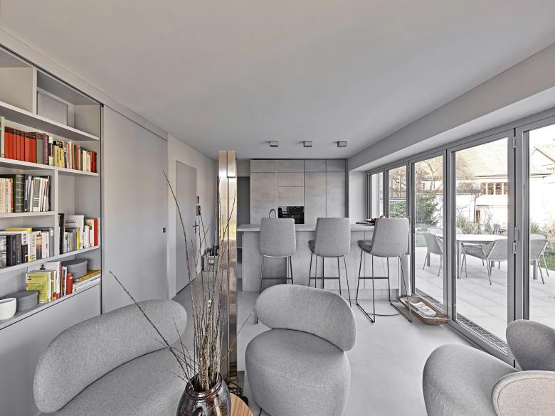 Umbau und grundlegende Sanierung des Bestands aus den 1970er Jahren für Wohnen, Office und Couture-Atelier. Umwidmung und Erweiterung der Garage zum Cubus, Umbau des Innenpools zur 2-geschossigen barrierefreien Einliegerwohnung mit Gästebereich.