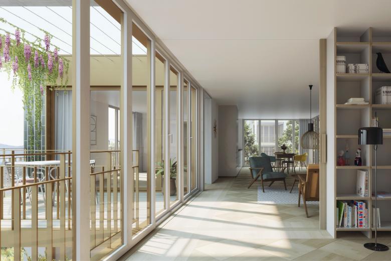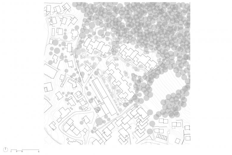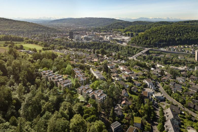 Acht kleinere Wohnhäuser sind – leicht gegeneinander versetzt – zu drei grossen Körpern zusammengeschoben, so dass die Bauten zwischen Punkt- und Scheibenhäusern oszillieren. Die so entstehende Struktur erlaubt es, alle Wohnungen nach drei Seiten zu öffnen – in die Weite, den Wald und den Landschaftsgarten. Höhensprünge um halbe Geschosse erhöhen die Privatsphäre in den Wohnungen. Das präzise Eingehen auf die Hanglage bietet eine unverstellte Aussicht von praktisch allen Wohnungen. Auch die Kleinwohnungen verfügen mit ihren Erkerausbildungen über eine hohe räumliche Qualität und greifen in den Grünraum hinein. So hat jede Wohnung das Flair einer Eckwohnung.